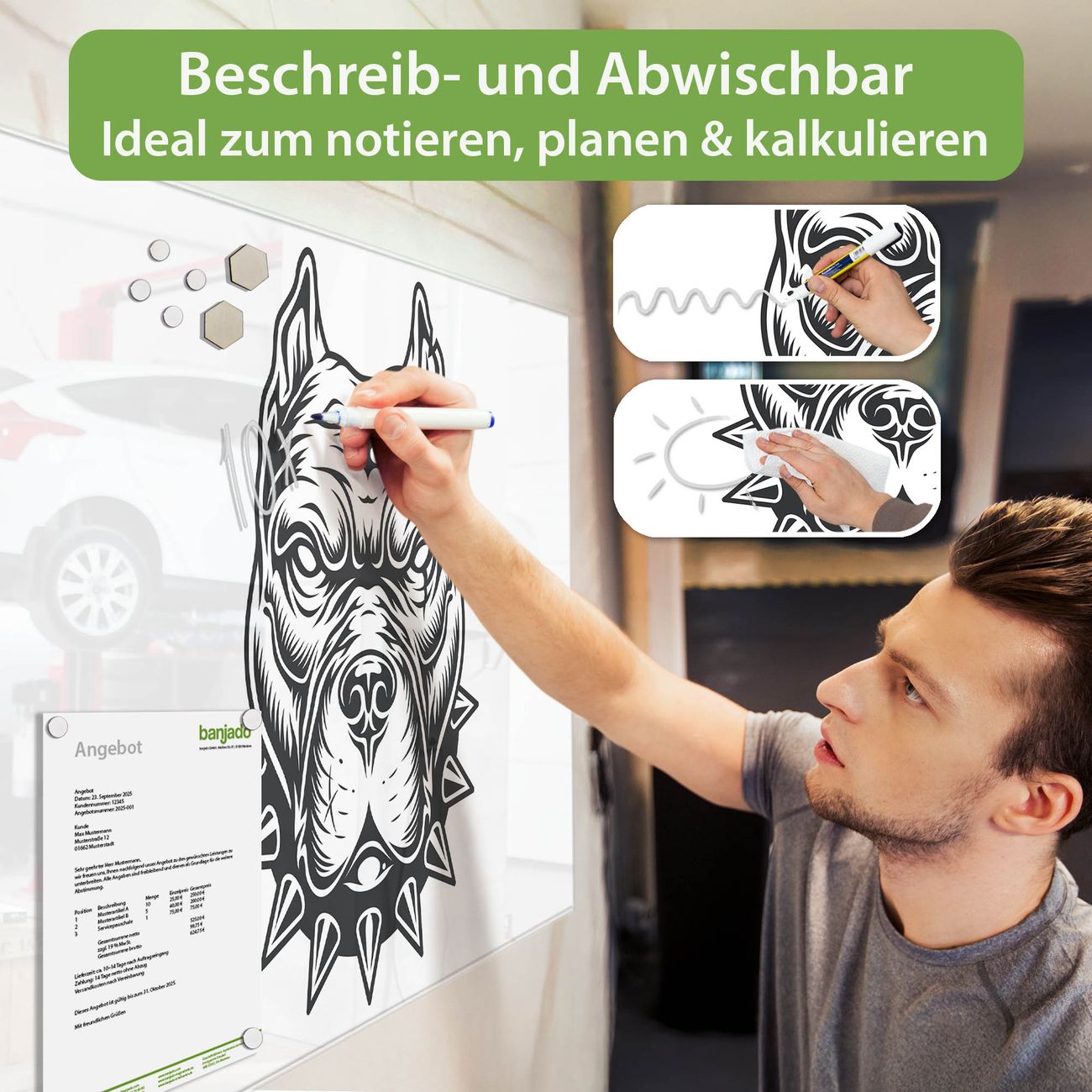 Bitte beachten Sie, dass ausschliessliche spezielle Magnete an der Glastafel haften. Wir empfehlen banjado Neodym Magnete, diese sind durch uns auf Wirksamkeit geprüft.