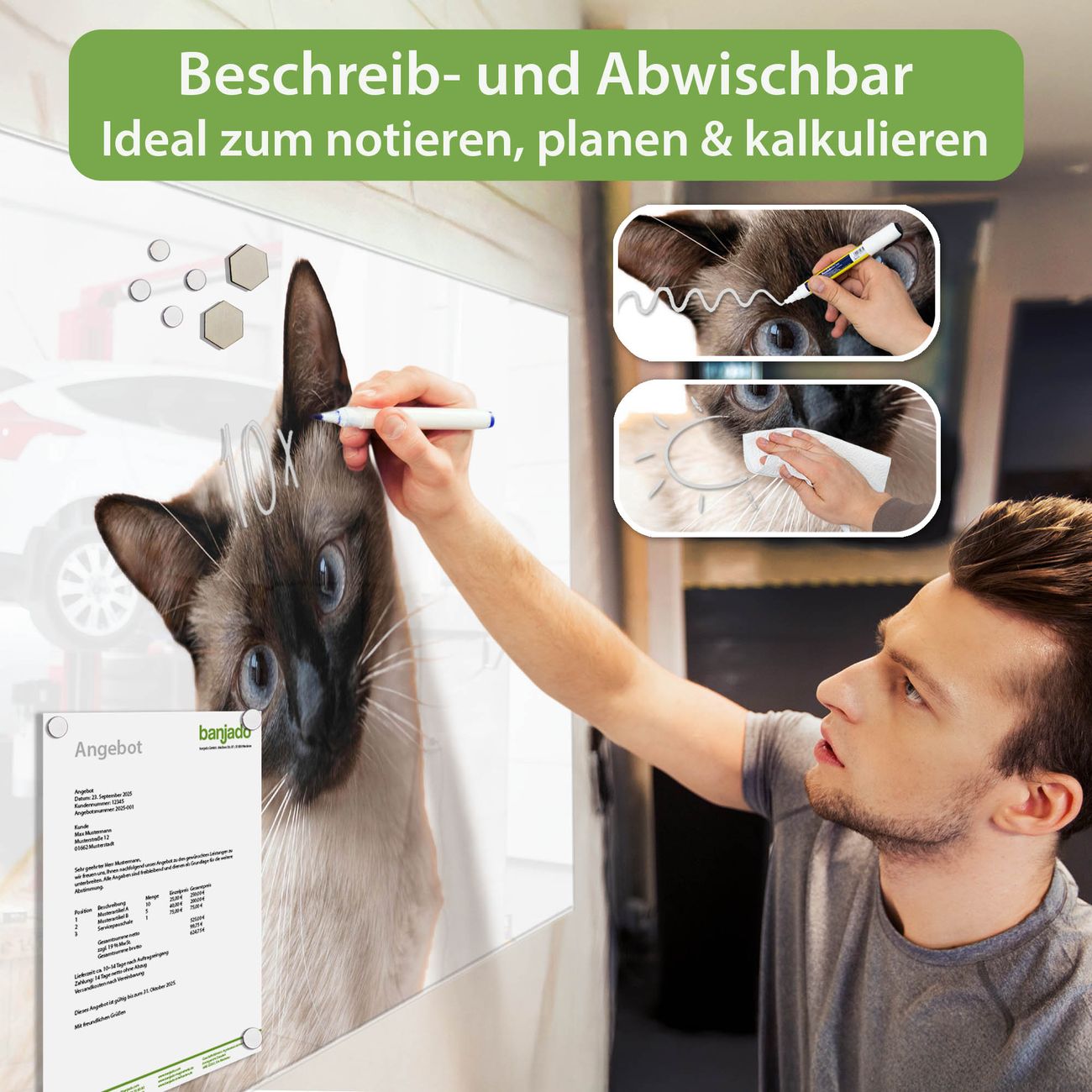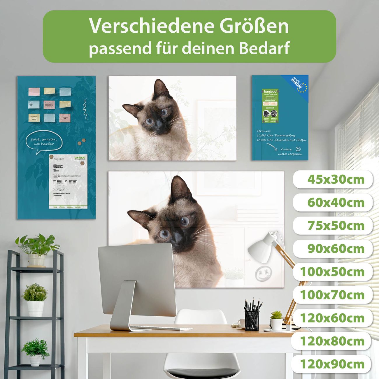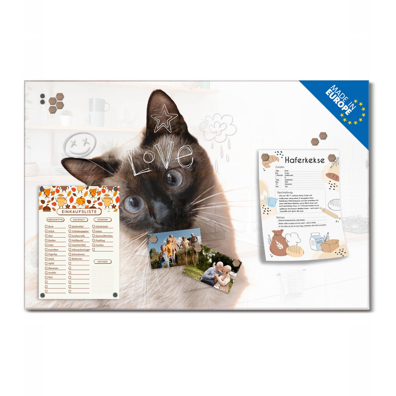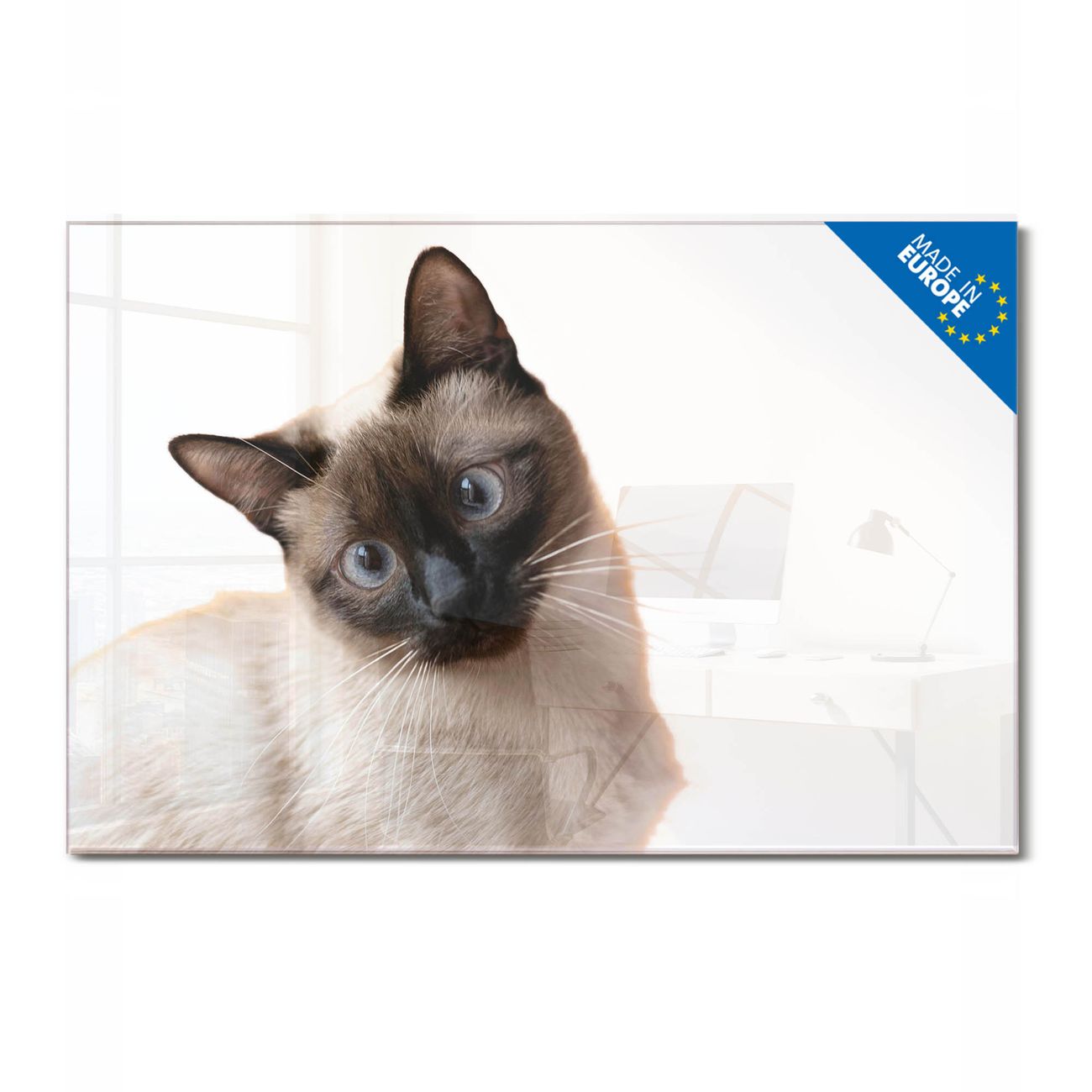 Material: 4mm Sicherheitsglas mit Metallrückwand Eigenschaften: beschreibbar, magnetisch, kratzfest Maße: 75x50x0,6cm, 5,63kg schwer Motiv Nummer 13438 Porträt einer Siamkatze Zubehör: inklusive 4 Neodym-Magnete