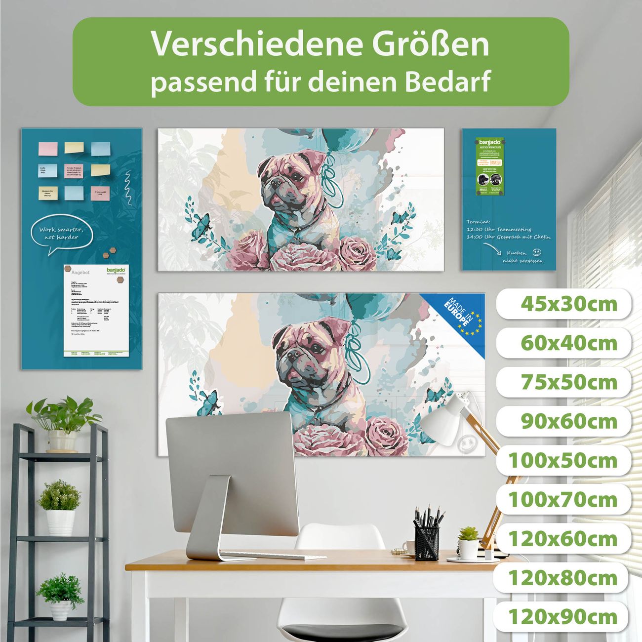 Material: 4mm Sicherheitsglas mit Metallrückwand Eigenschaften: beschreibbar, magnetisch, kratzfest Maße: 100x50x0,6cm, 7,50kg schwer Motiv Nummer 13415 Pudeliges Blumenglück Zubehör: inklusive 4 Neodym-Magnete