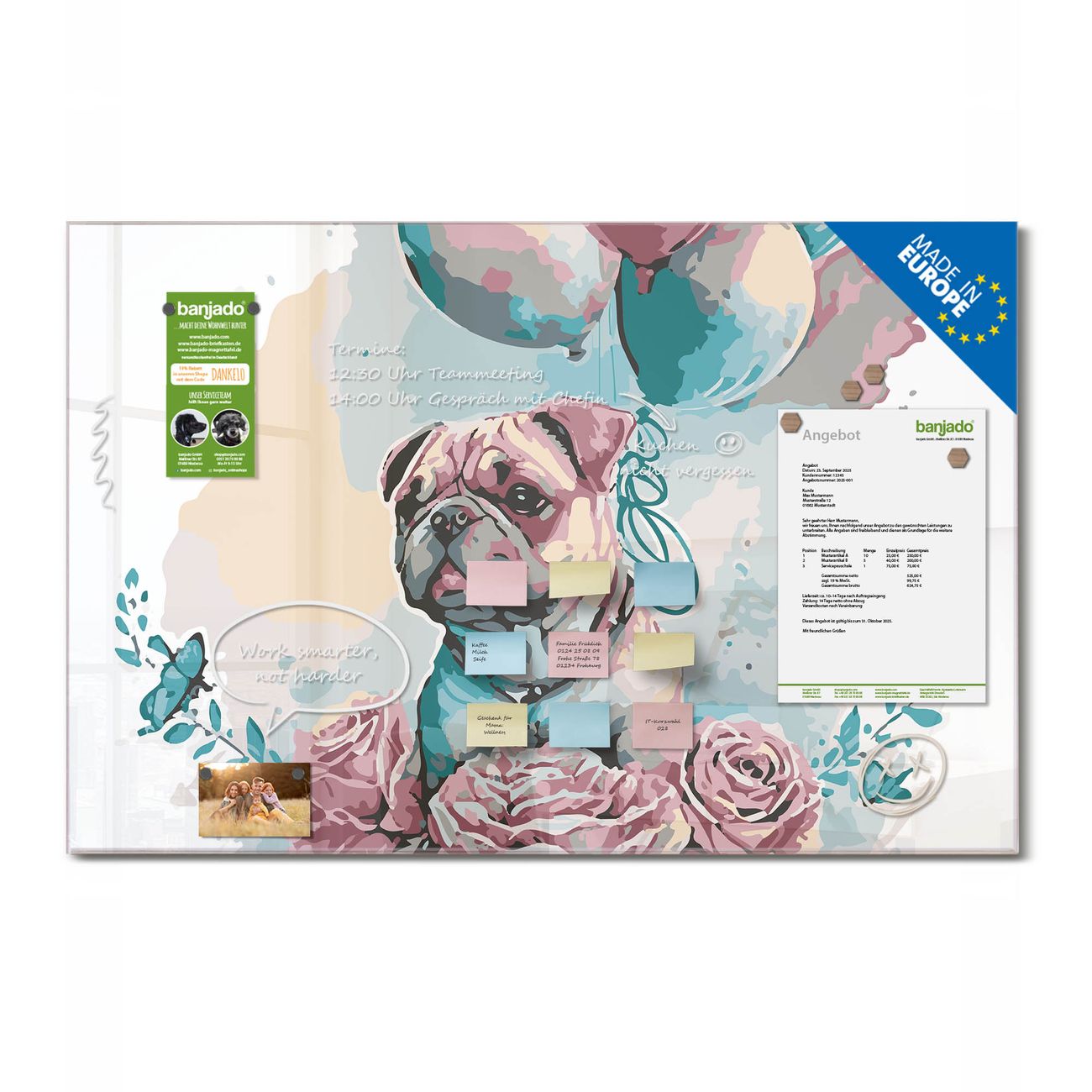 Ein Stück Design, das Ihren Alltag organisiert. Schreiben, heften, inspirieren - alles an einem Ort. Qualität, die man spürt. Montage leicht gemacht. Handwerk mit Herz - veredelt in Sachsen. Einzigartiges Design mit Motiv Motiv Pudeliges Blumenglück Beschreibbare Glasoberfläche, leicht zu reinigen Starke Magnetkraft durch Stahlrückwand Inklusive 4 Neodym-Magneten Flexible Montageoptionen Handveredelt in Sachsen - Qualität, die bleibt