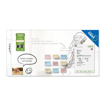Material: 4mm Sicherheitsglas mit Metallrückwand Eigenschaften: beschreibbar, magnetisch, kratzfest Maße: 100x50x0,6cm, 7,50kg schwer Motiv Nummer 13035 Qualle 4 Zubehör: inklusive 4 Neodym-Magnete
