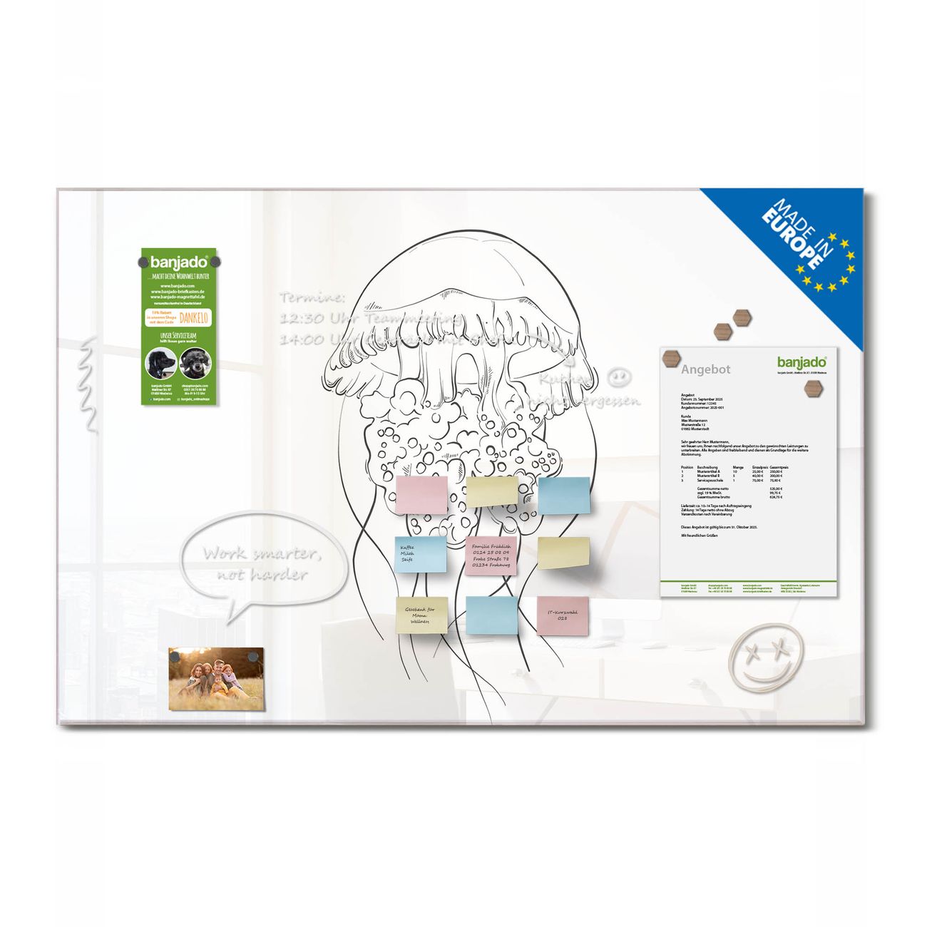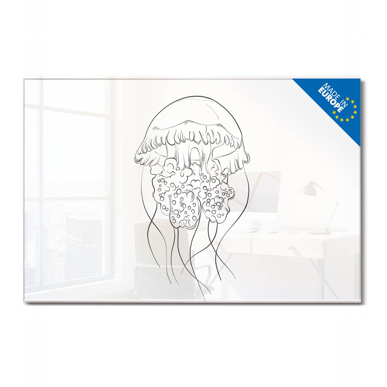 Material: 4mm Sicherheitsglas mit Metallrückwand Eigenschaften: beschreibbar, magnetisch, kratzfest Maße: 120x80x0,6cm, 14,40kg schwer Motiv Nummer 13036 Qualle 5 Zubehör: inklusive 4 Neodym-Magnete