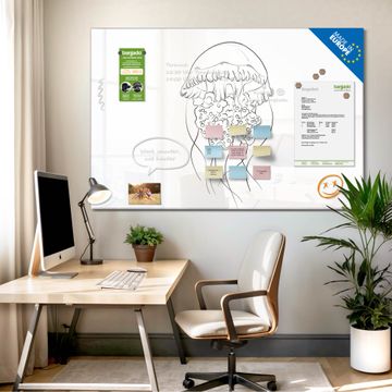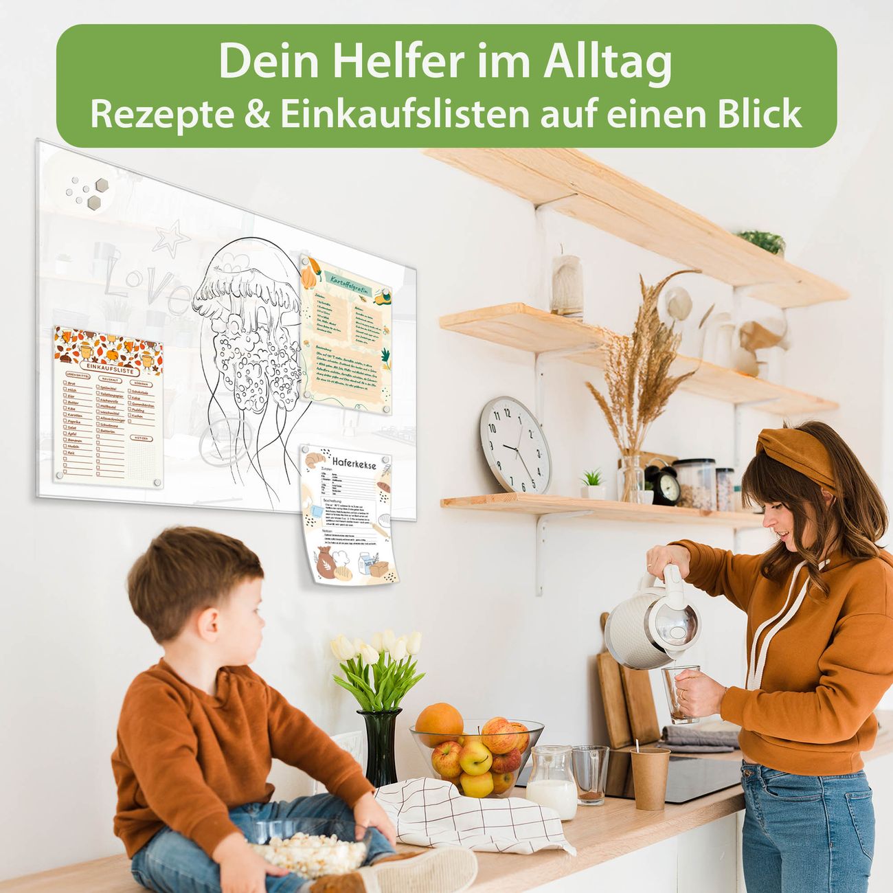Auf der glatten Glasoberfläche lassen sich Termine, Rezepte oder Notizen ganz einfach mit Kreidestiften festhalten und rückstandslos entfernen. Starke Neodym-Magnete halten Ihre wichtigsten Erinnerungen sicher an Ort und Stelle. So entsteht Ihre ganz persönliche Ideenwand - jeden Tag neu.
