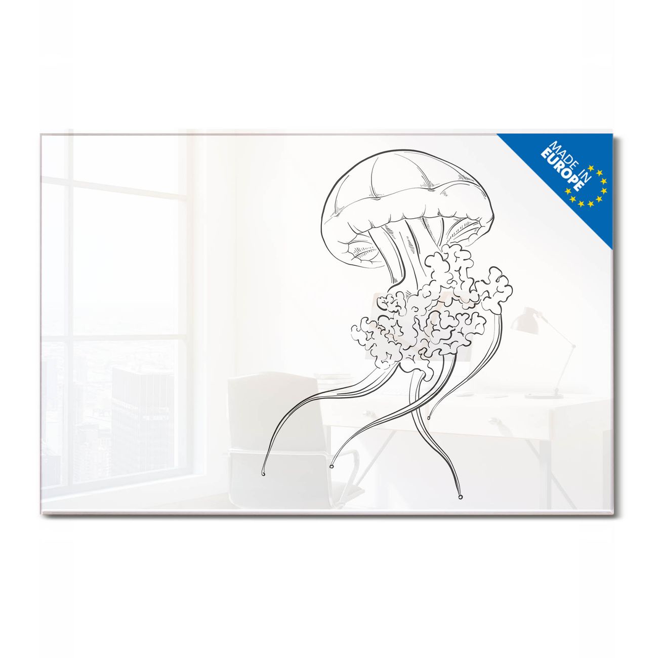 Material: 4mm Sicherheitsglas mit Metallrückwand Eigenschaften: beschreibbar, magnetisch, kratzfest Maße: 90x60x0,6cm, 8,10kg schwer Motiv Nummer 13037 Qualle 6 Zubehör: inklusive 4 Neodym-Magnete
