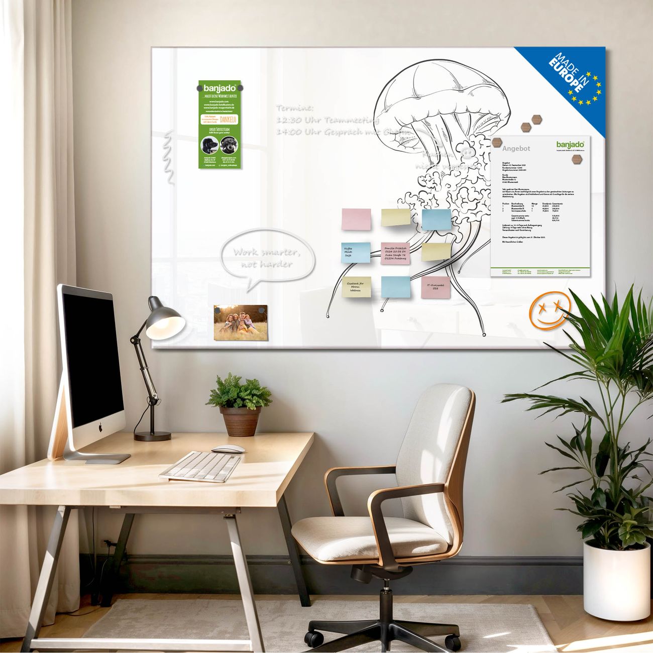 Jede Glas Magnettafel wird in unserer Werkstatt von Hand gefertigt und sorgfältig geprüft. So erhalten Sie ein echtes Qualitätsprodukt, das Funktion und Ästhetik perfekt vereint.?? Warum banjado?