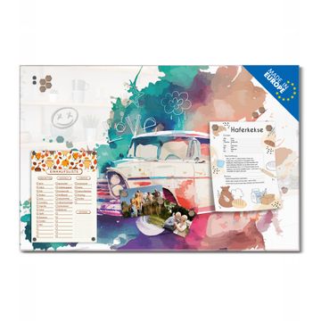 Material: 4mm Sicherheitsglas mit Metallrückwand Eigenschaften: beschreibbar, magnetisch, kratzfest Maße: 75x50x0,6cm, 5,63kg schwer Motiv Nummer 13147 Retro-Auto in Aquarell Zubehör: inklusive 4 Neodym-Magnete