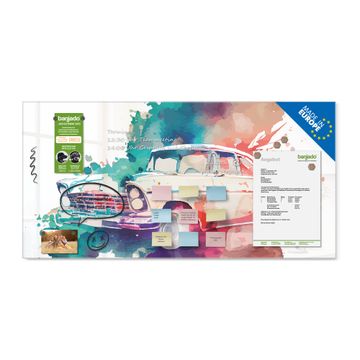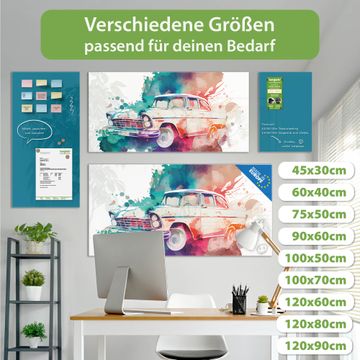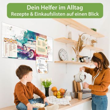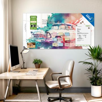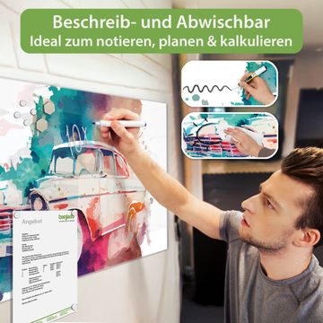 Material: 4mm Sicherheitsglas mit Metallrückwand Eigenschaften: beschreibbar, magnetisch, kratzfest Maße: 100x50x0,6cm, 7,50kg schwer Motiv Nummer 13147 Retro-Auto in Aquarell Zubehör: inklusive 4 Neodym-Magnete