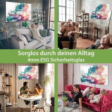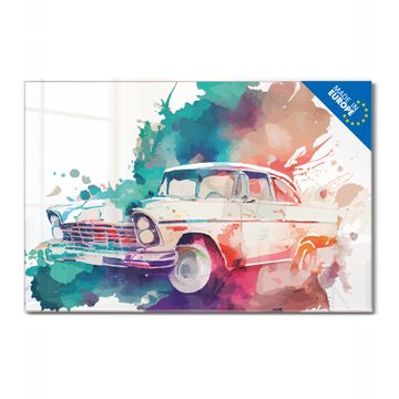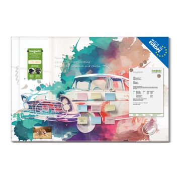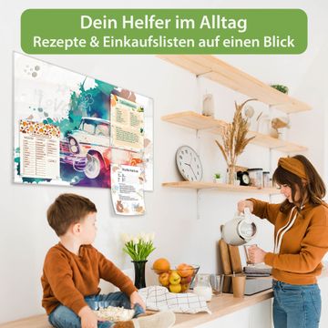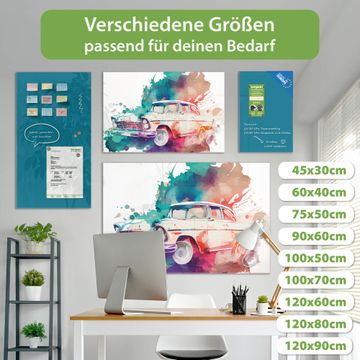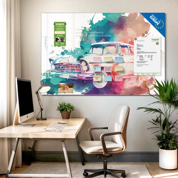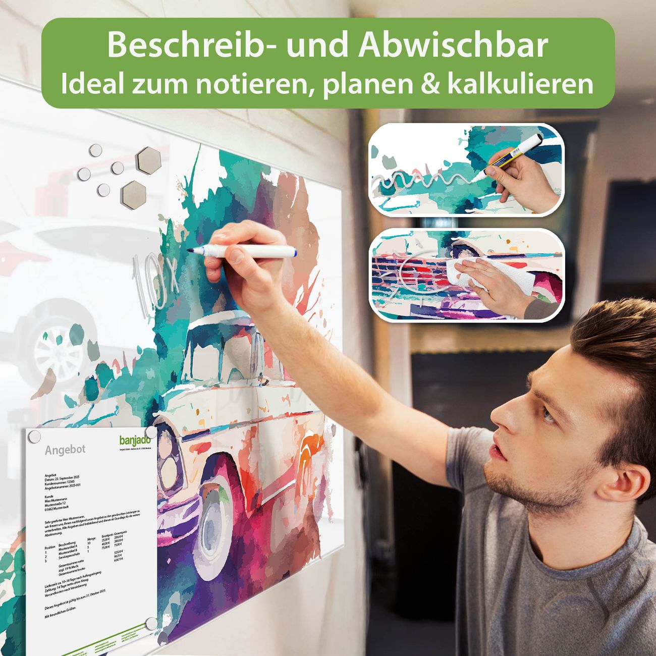 Material: 4mm Sicherheitsglas mit Metallrückwand Eigenschaften: beschreibbar, magnetisch, kratzfest Maße: 120x80x0,6cm, 14,40kg schwer Motiv Nummer 13147 Retro-Auto in Aquarell Zubehör: inklusive 4 Neodym-Magnete