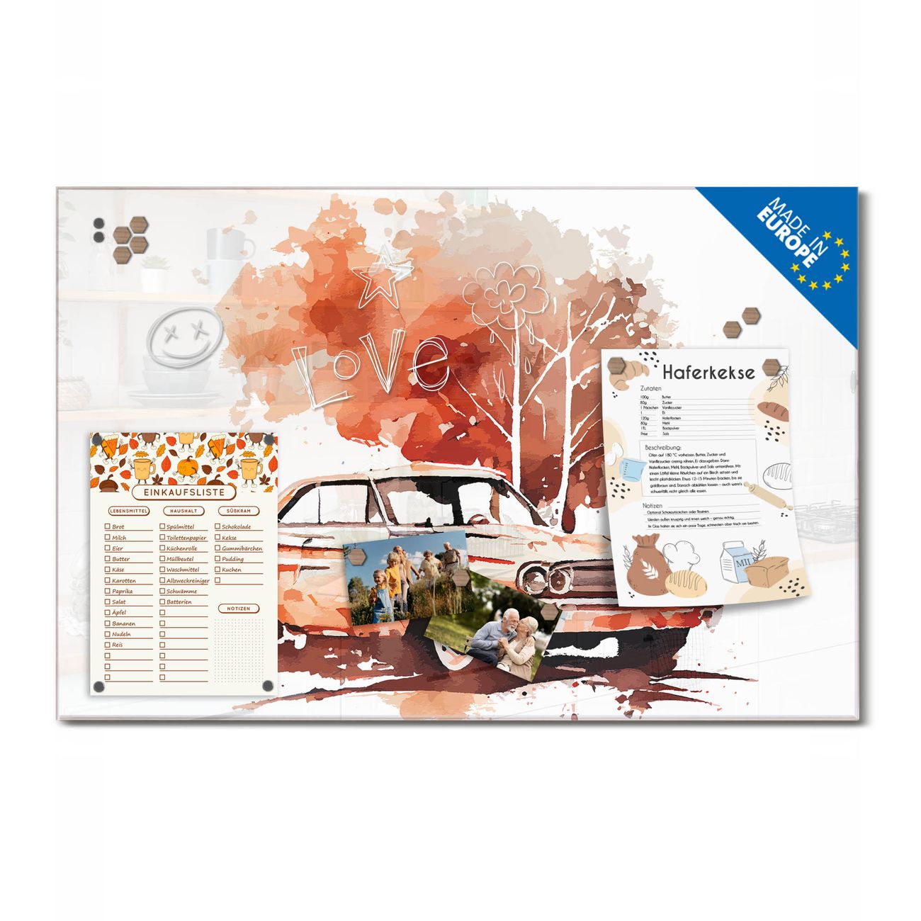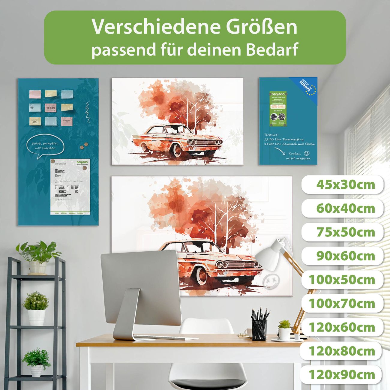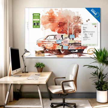 Material: 4mm Sicherheitsglas mit Metallrückwand Eigenschaften: beschreibbar, magnetisch, kratzfest Maße: 75x50x0,6cm, 5,63kg schwer Motiv Nummer 13148 Retro-Fahrzeug in der Landschaft Zubehör: inklusive 4 Neodym-Magnete