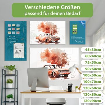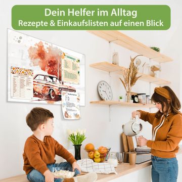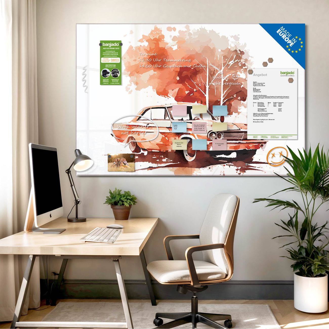 Die banjado Glas Magnettafel mit dem Motiv Motiv Retro-Fahrzeug in der Landschaft verbindet Funktionalität mit Stil. Sie ersetzt das Zettelchaos durch klare Strukturen und bringt dabei eine warme, natürliche Atmosphäre in Ihr Zuhause. Ob im Büro, in der Küche oder im Eingangsbereich - dieses Design-Board zieht Blicke an und sorgt für Ordnung mit Charakter.