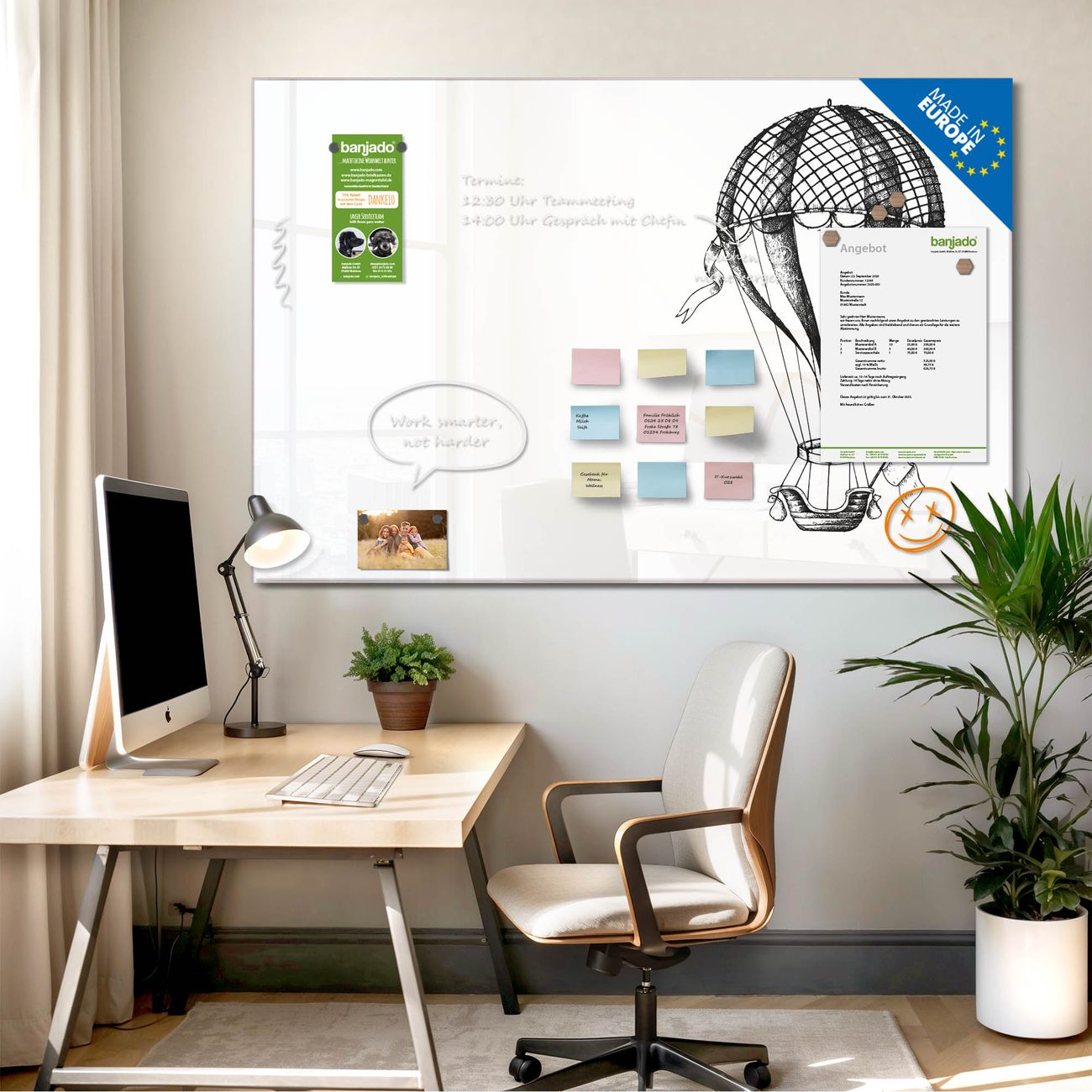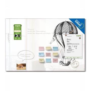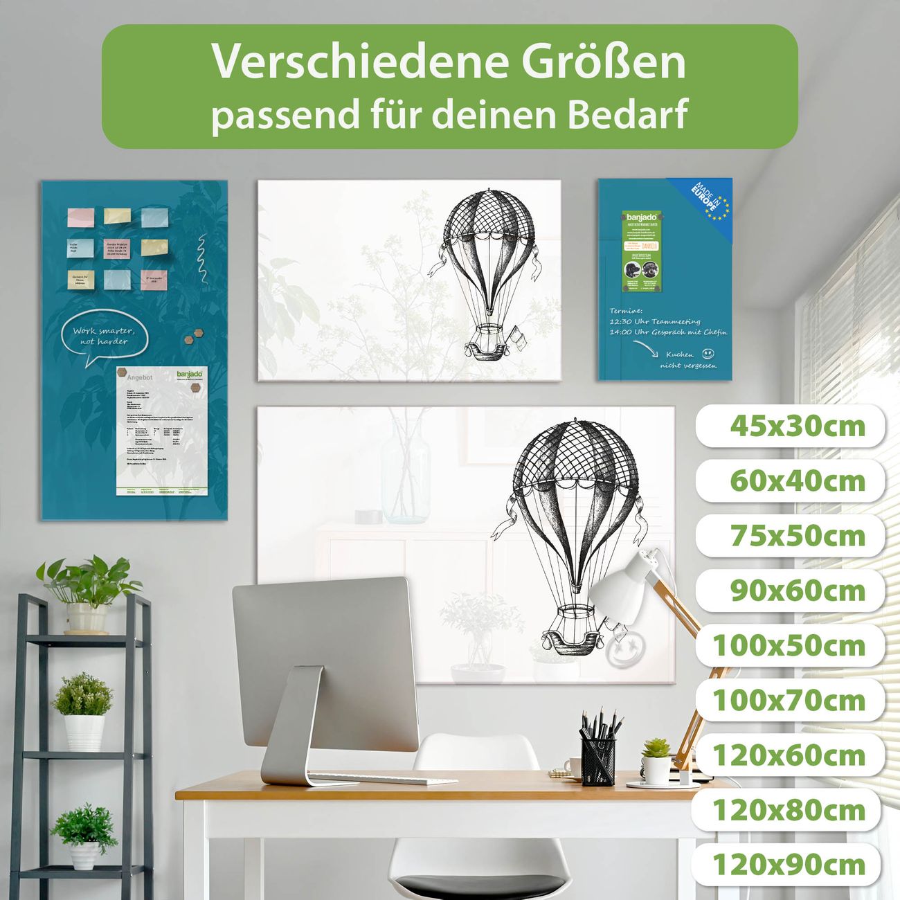 Material: 4mm Sicherheitsglas mit Metallrückwand Eigenschaften: beschreibbar, magnetisch, kratzfest Maße: 120x80x0,6cm, 14,40kg schwer Motiv Nummer 13174 Retro Heißluftballon Zubehör: inklusive 4 Neodym-Magnete