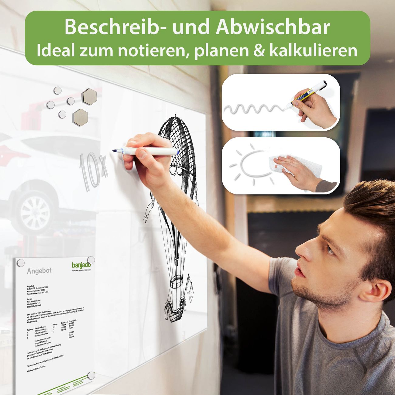 Bitte beachten Sie, dass ausschliessliche spezielle Magnete an der Glastafel haften. Wir empfehlen banjado Neodym Magnete, diese sind durch uns auf Wirksamkeit geprüft.