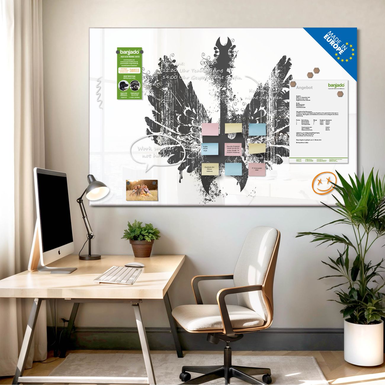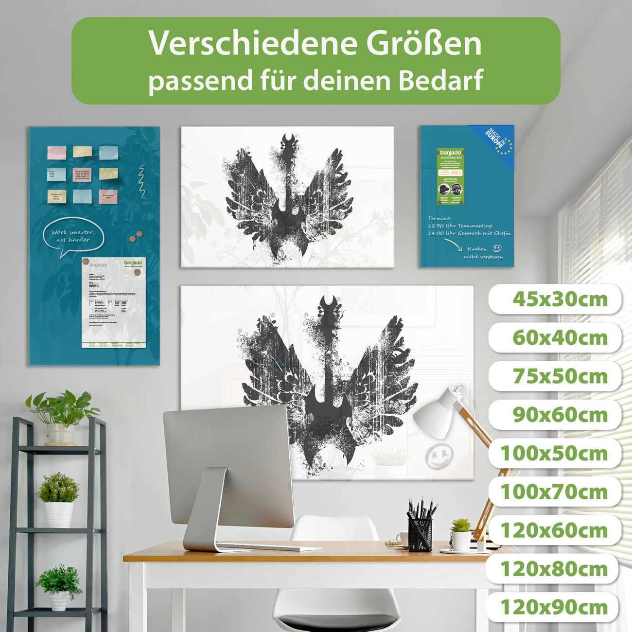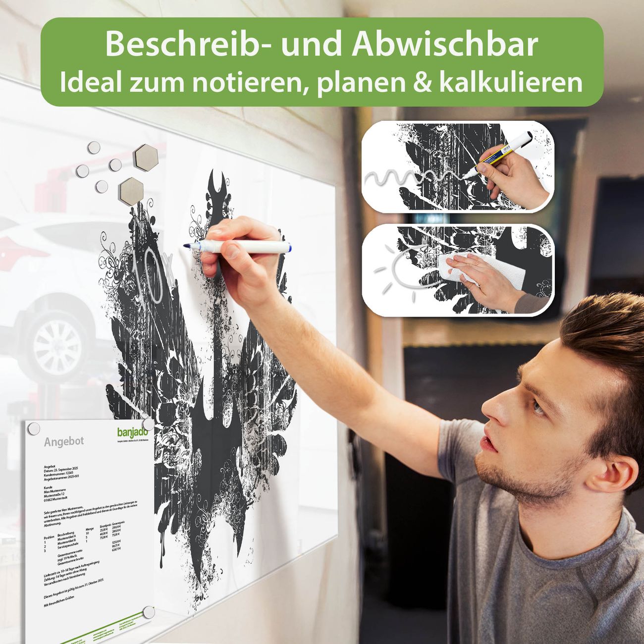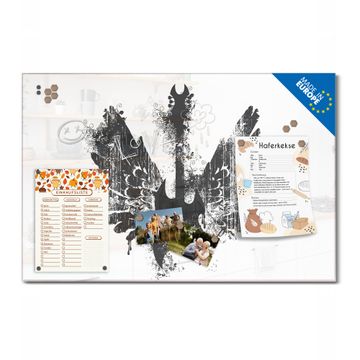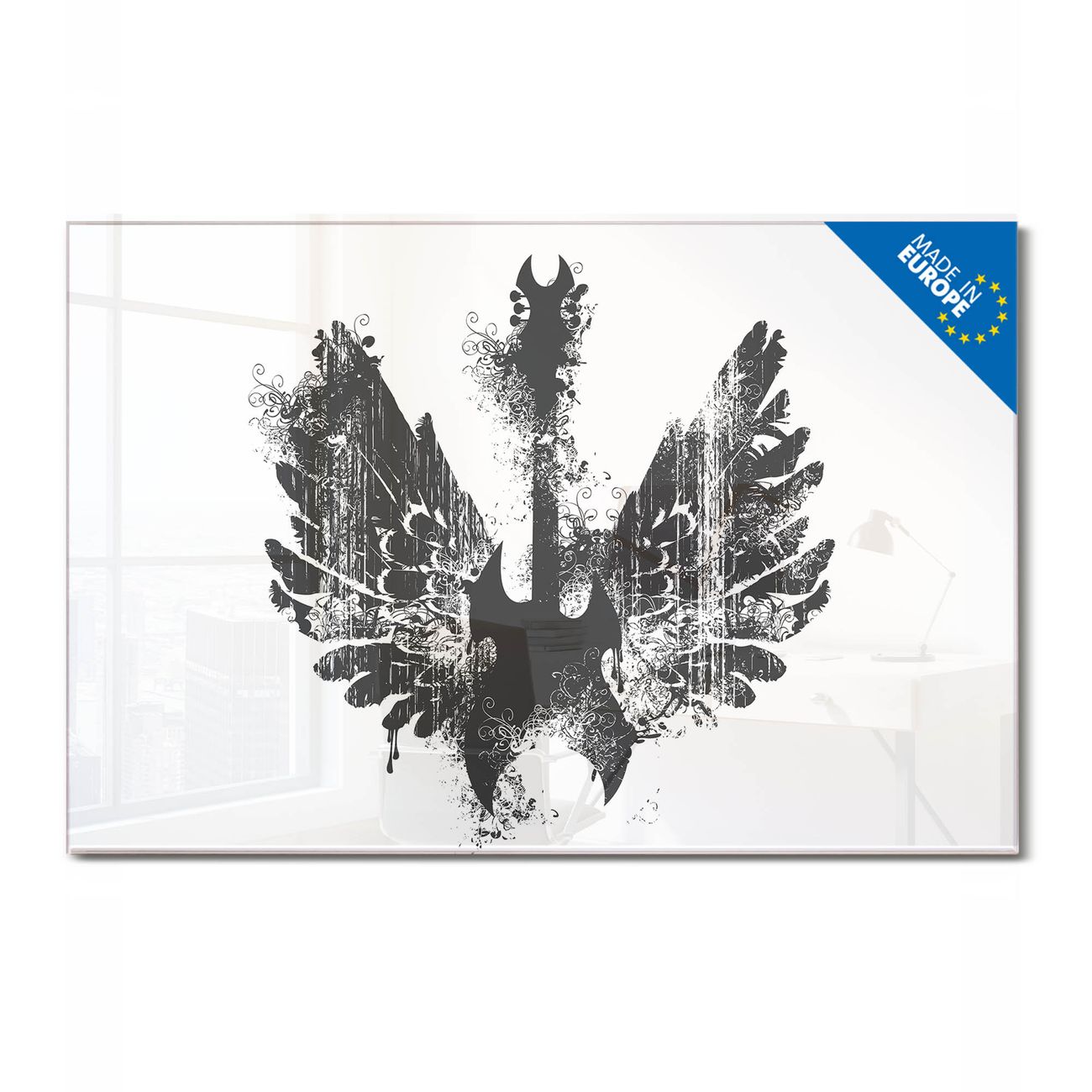 Material: 4mm Sicherheitsglas mit Metallrückwand Eigenschaften: beschreibbar, magnetisch, kratzfest Maße: 75x50x0,6cm, 5,63kg schwer Motiv Nummer 13322 Rock Wings Zubehör: inklusive 4 Neodym-Magnete