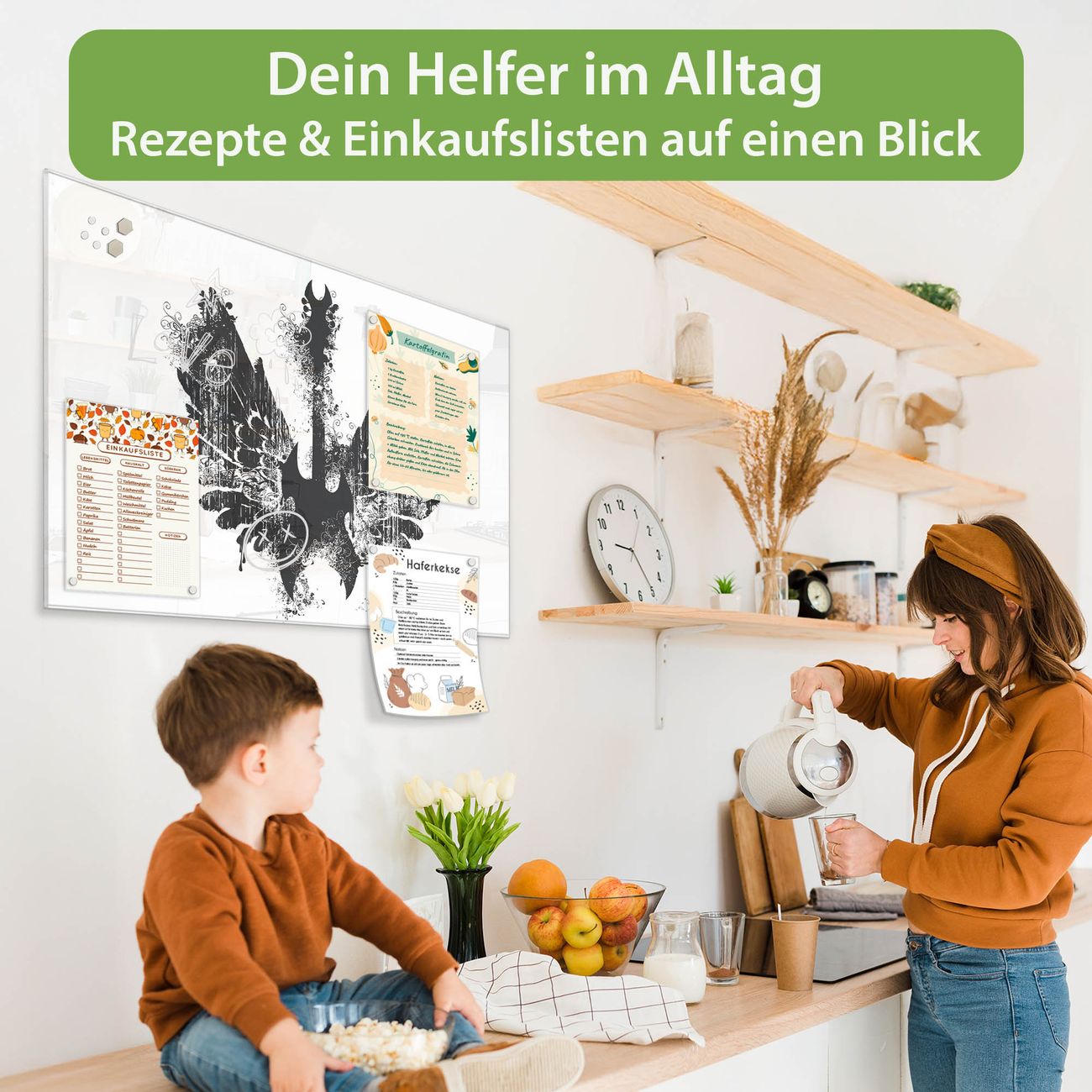 Ein Stück Design, das Ihren Alltag organisiert. Schreiben, heften, inspirieren - alles an einem Ort. Qualität, die man spürt. Montage leicht gemacht. Handwerk mit Herz - veredelt in Sachsen. Einzigartiges Design mit Motiv Motiv Rock Wings Beschreibbare Glasoberfläche, leicht zu reinigen Starke Magnetkraft durch Stahlrückwand Inklusive 4 Neodym-Magneten Flexible Montageoptionen Handveredelt in Sachsen - Qualität, die bleibt