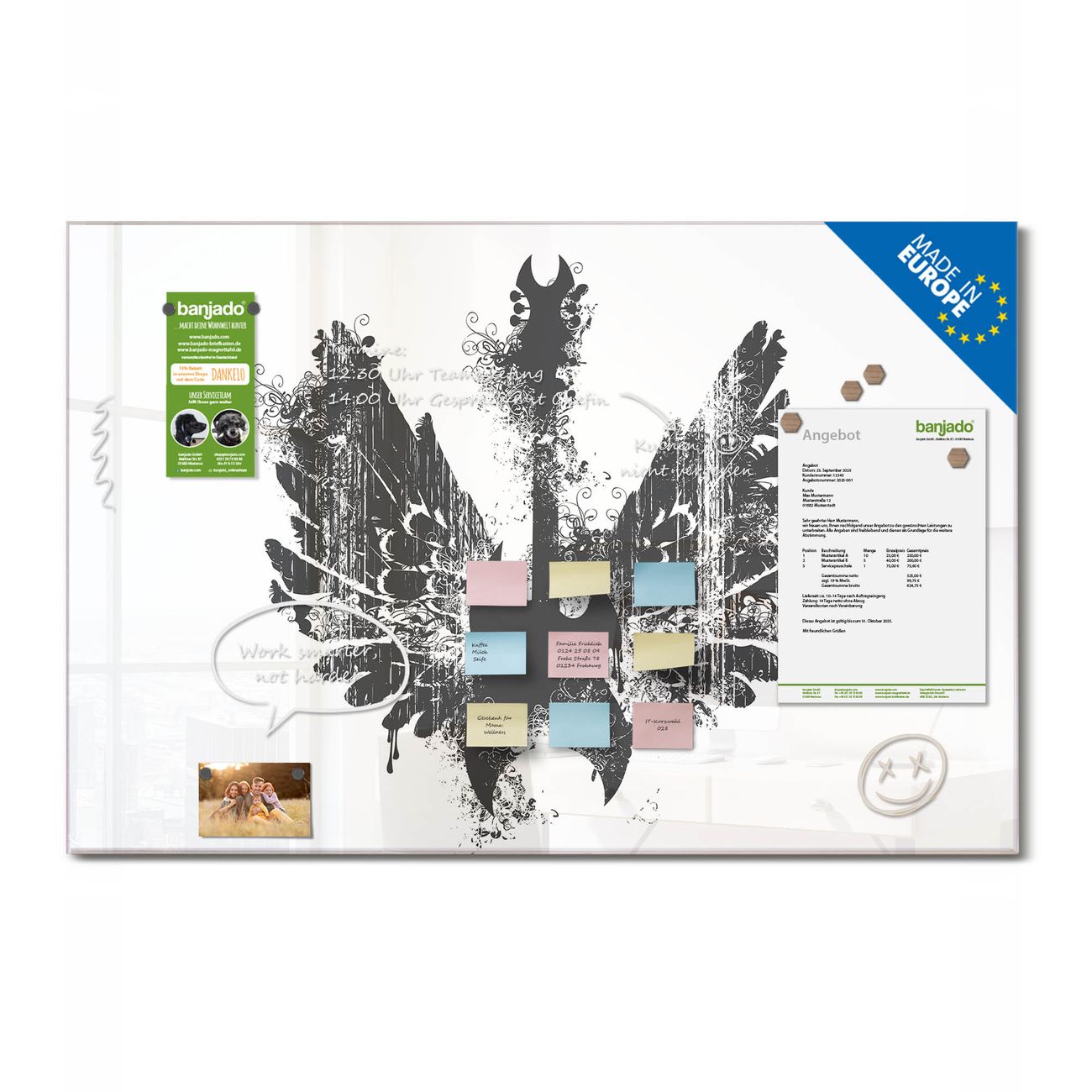 Material: 4mm Sicherheitsglas mit Metallrückwand Eigenschaften: beschreibbar, magnetisch, kratzfest Maße: 120x80x0,6cm, 14,40kg schwer Motiv Nummer 13322 Rock Wings Zubehör: inklusive 4 Neodym-Magnete