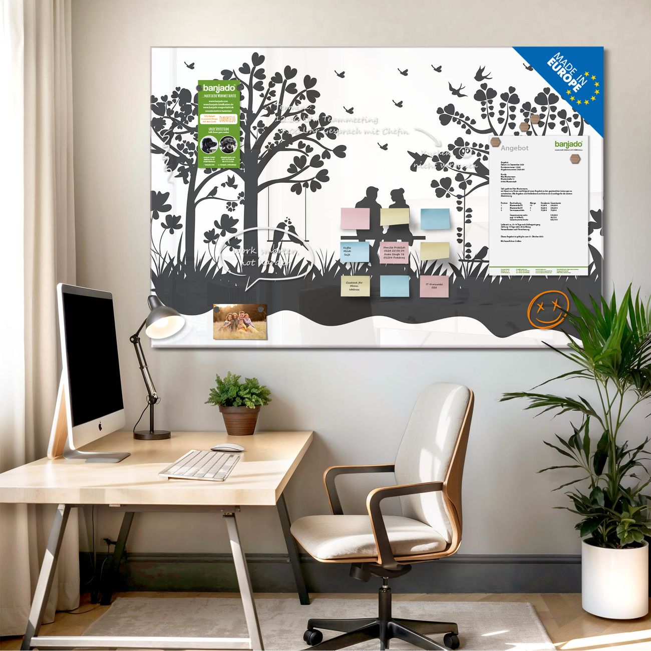 Jede Glas Magnettafel wird in unserer Werkstatt von Hand gefertigt und sorgfältig geprüft. So erhalten Sie ein echtes Qualitätsprodukt, das Funktion und Ästhetik perfekt vereint.?? Warum banjado?