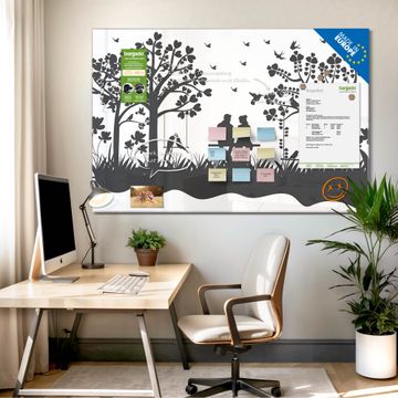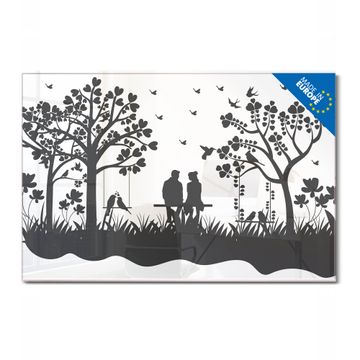 Material: 4mm Sicherheitsglas mit Metallrückwand Eigenschaften: beschreibbar, magnetisch, kratzfest Maße: 60x40x0,6cm, 3,6kg schwer Motiv Nummer 13354 Romantische Silhouette im Park Zubehör: inklusive 4 Neodym-Magnete