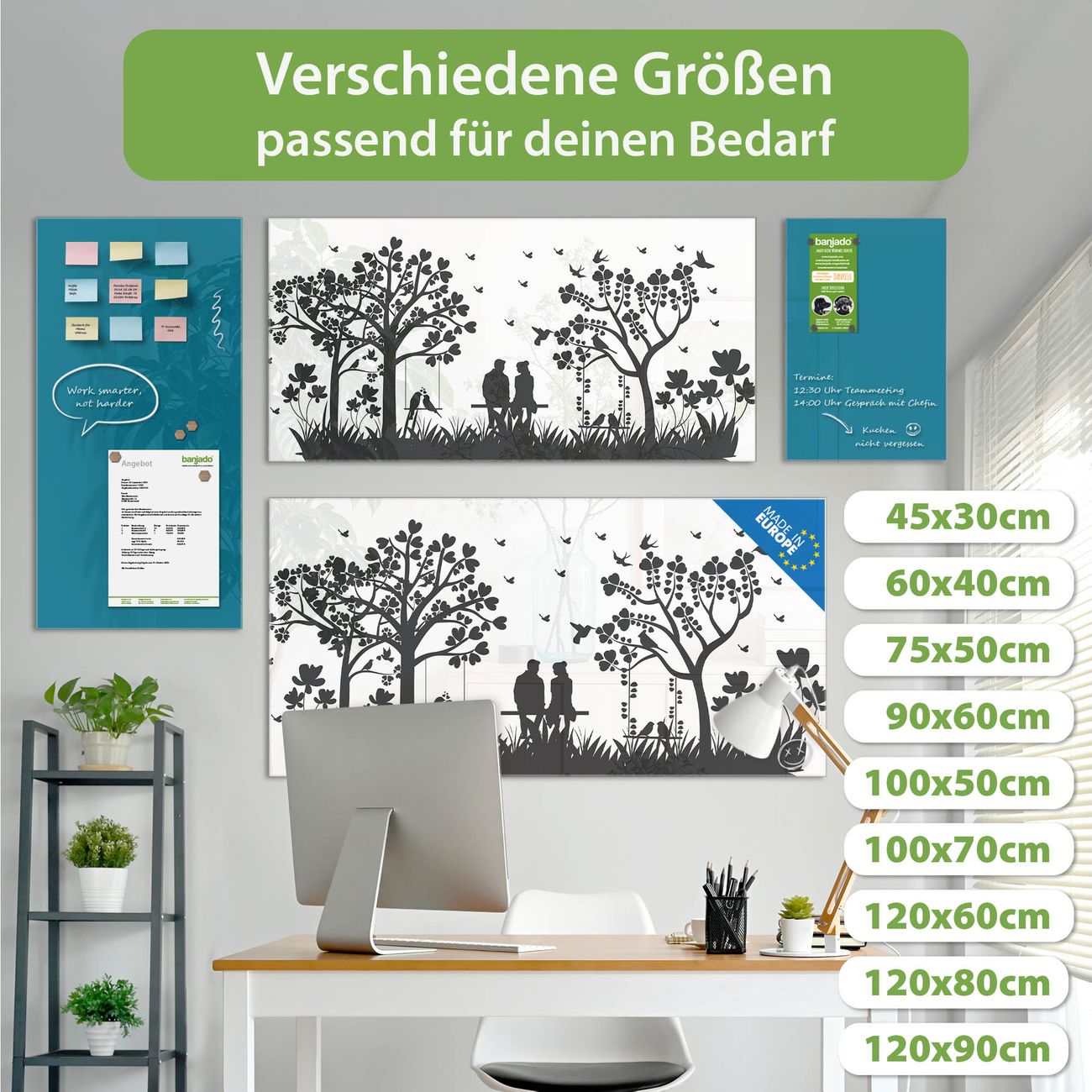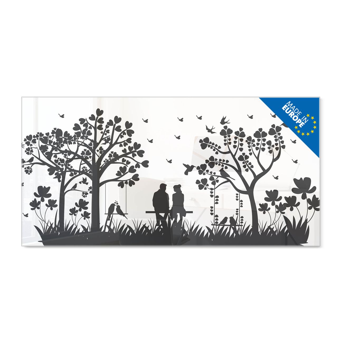 Material: 4mm Sicherheitsglas mit Metallrückwand Eigenschaften: beschreibbar, magnetisch, kratzfest Maße: 100x50x0,6cm, 7,50kg schwer Motiv Nummer 13354 Romantische Silhouette im Park Zubehör: inklusive 4 Neodym-Magnete
