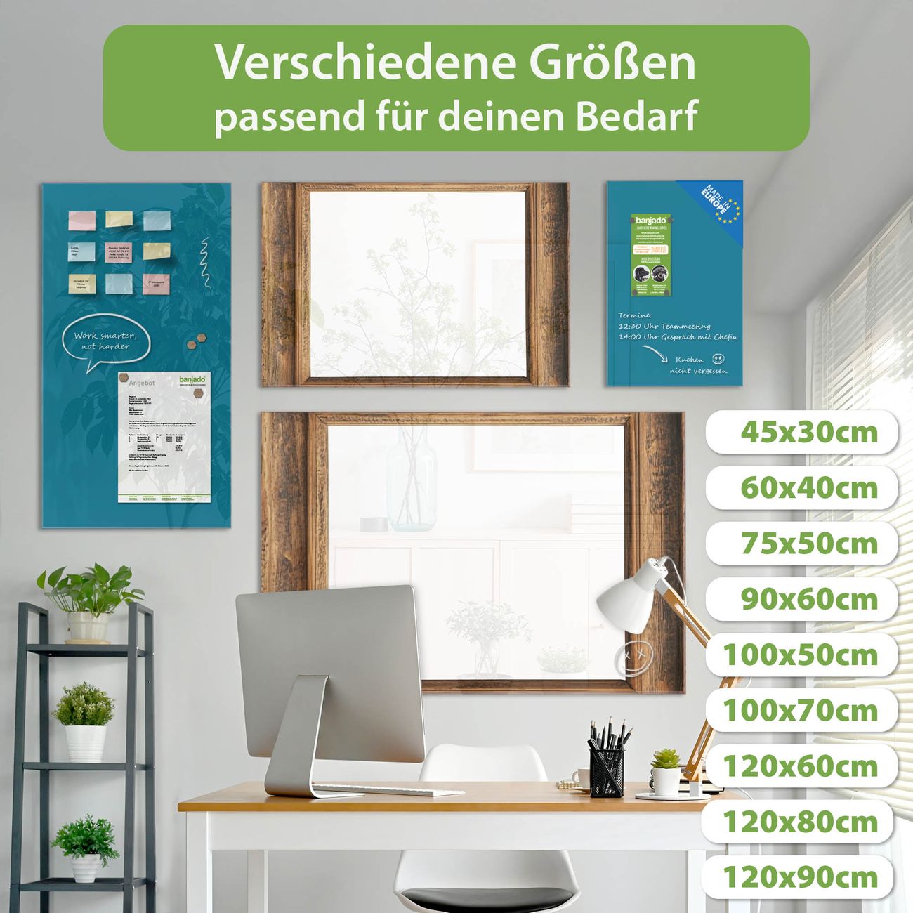 Material: 4mm Sicherheitsglas mit Metallrückwand Eigenschaften: beschreibbar, magnetisch, kratzfest Maße: 120x80x0,6cm, 14,40kg schwer Motiv Nummer 13553 Rustikaler Holzrahmen Zubehör: inklusive 4 Neodym-Magnete