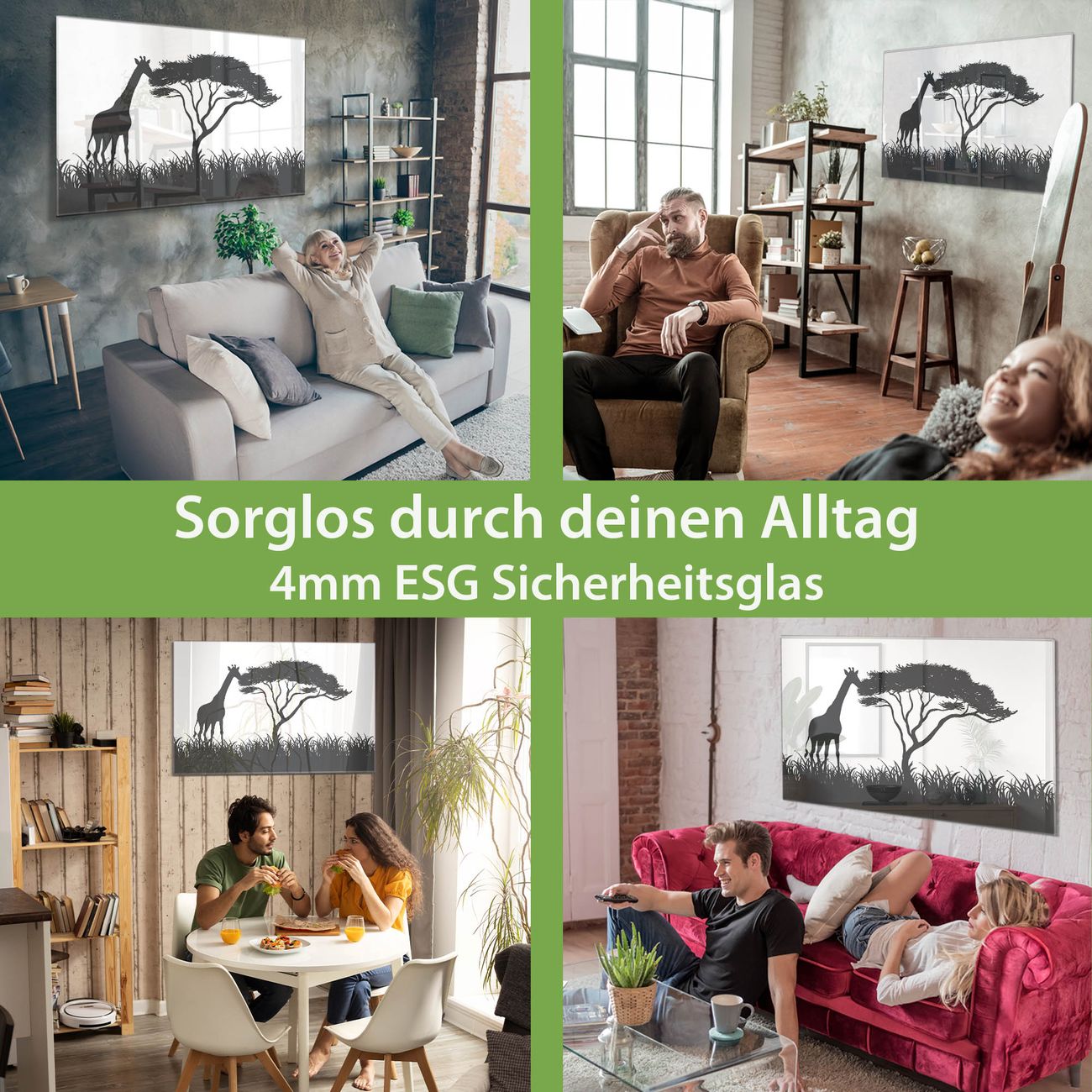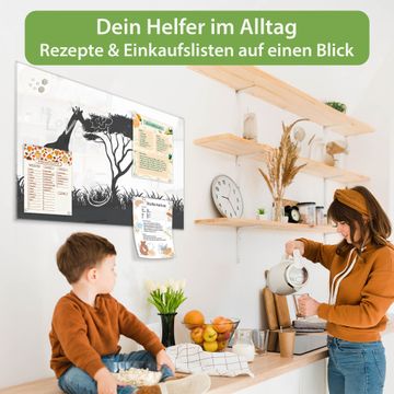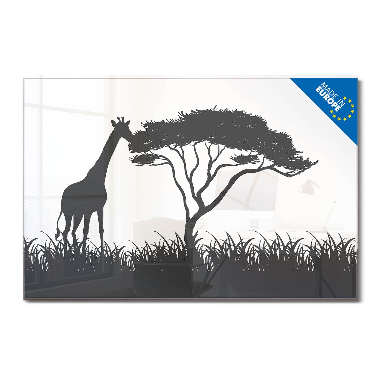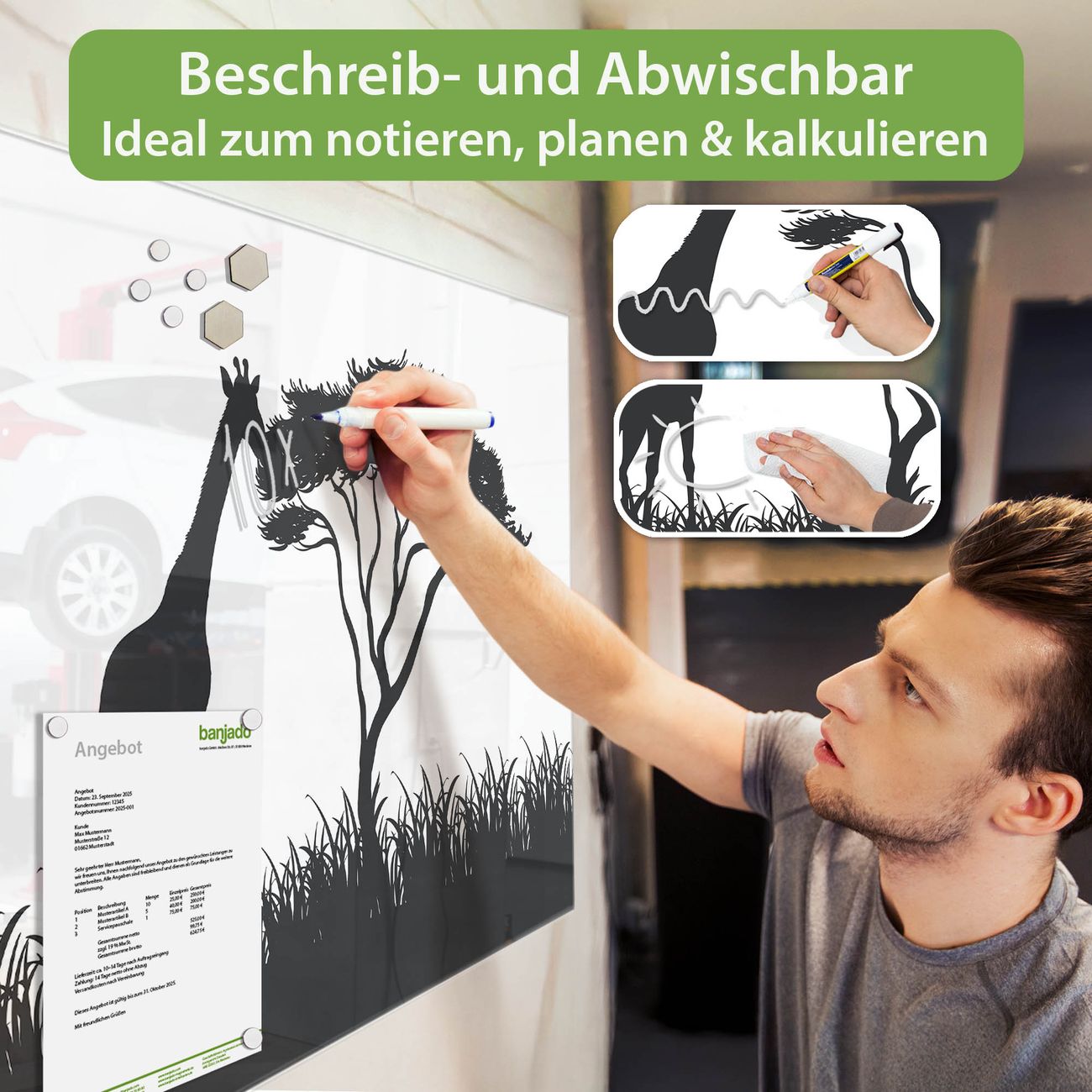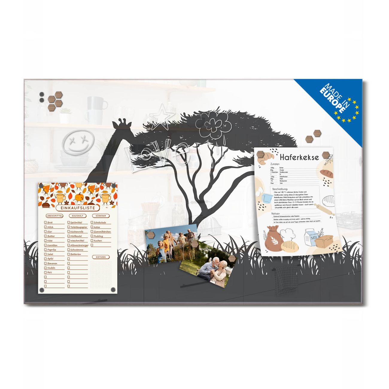 Material: 4mm Sicherheitsglas mit Metallrückwand Eigenschaften: beschreibbar, magnetisch, kratzfest Maße: 75x50x0,6cm, 5,63kg schwer Motiv Nummer 13344 Savannen-Silhouette Zubehör: inklusive 4 Neodym-Magnete