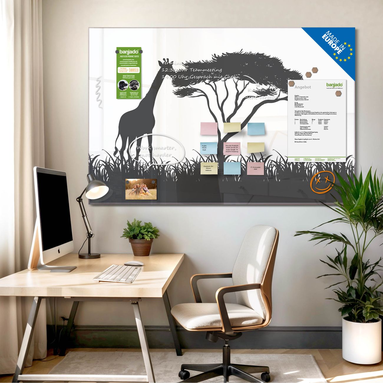 Die banjado Glas Magnettafel mit dem Motiv Motiv Savannen-Silhouette verbindet Funktionalität mit Stil. Sie ersetzt das Zettelchaos durch klare Strukturen und bringt dabei eine warme, natürliche Atmosphäre in Ihr Zuhause. Ob im Büro, in der Küche oder im Eingangsbereich - dieses Design-Board zieht Blicke an und sorgt für Ordnung mit Charakter.