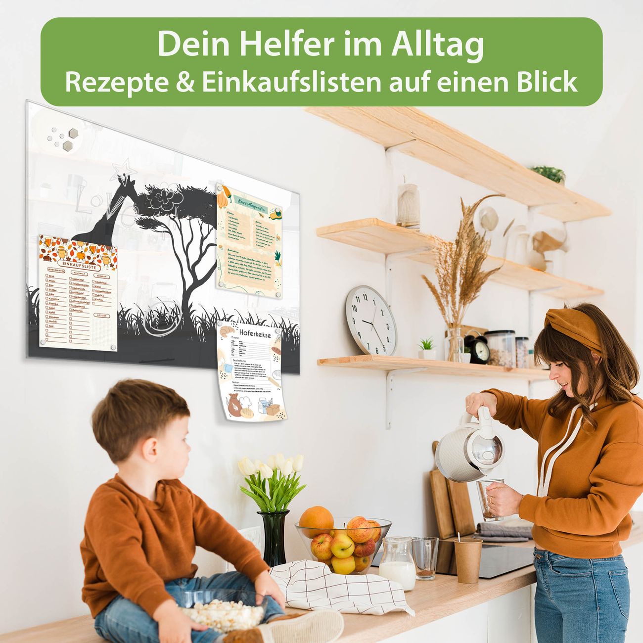 Ein Stück Design, das Ihren Alltag organisiert. Schreiben, heften, inspirieren - alles an einem Ort. Qualität, die man spürt. Montage leicht gemacht. Handwerk mit Herz - veredelt in Sachsen. Einzigartiges Design mit Motiv Motiv Savannen-Silhouette Beschreibbare Glasoberfläche, leicht zu reinigen Starke Magnetkraft durch Stahlrückwand Inklusive 4 Neodym-Magneten Flexible Montageoptionen Handveredelt in Sachsen - Qualität, die bleibt