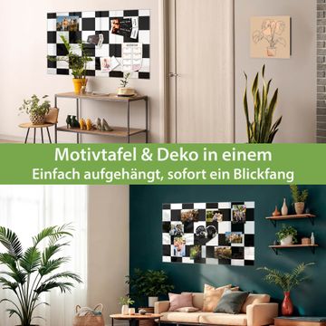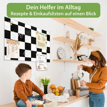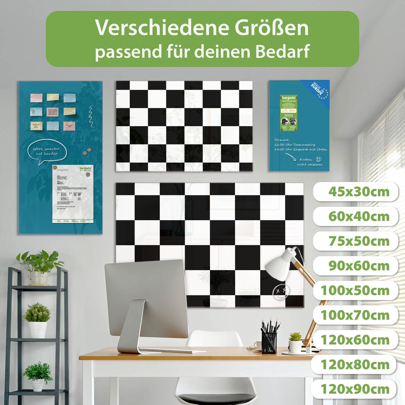 Material: 4mm Sicherheitsglas mit Metallrückwand Eigenschaften: beschreibbar, magnetisch, kratzfest Maße: 90x60x0,6cm, 8,10kg schwer Motiv Nummer 13001 Schachbrettmuster Zubehör: inklusive 4 Neodym-Magnete
