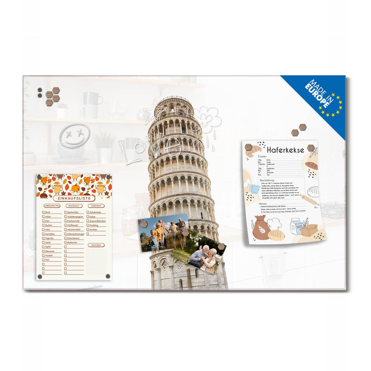 Material: 4mm Sicherheitsglas mit Metallrückwand Eigenschaften: beschreibbar, magnetisch, kratzfest Maße: 75x50x0,6cm, 5,63kg schwer Motiv Nummer 13244 Schiefer Turm von Pisa 2 Zubehör: inklusive 4 Neodym-Magnete