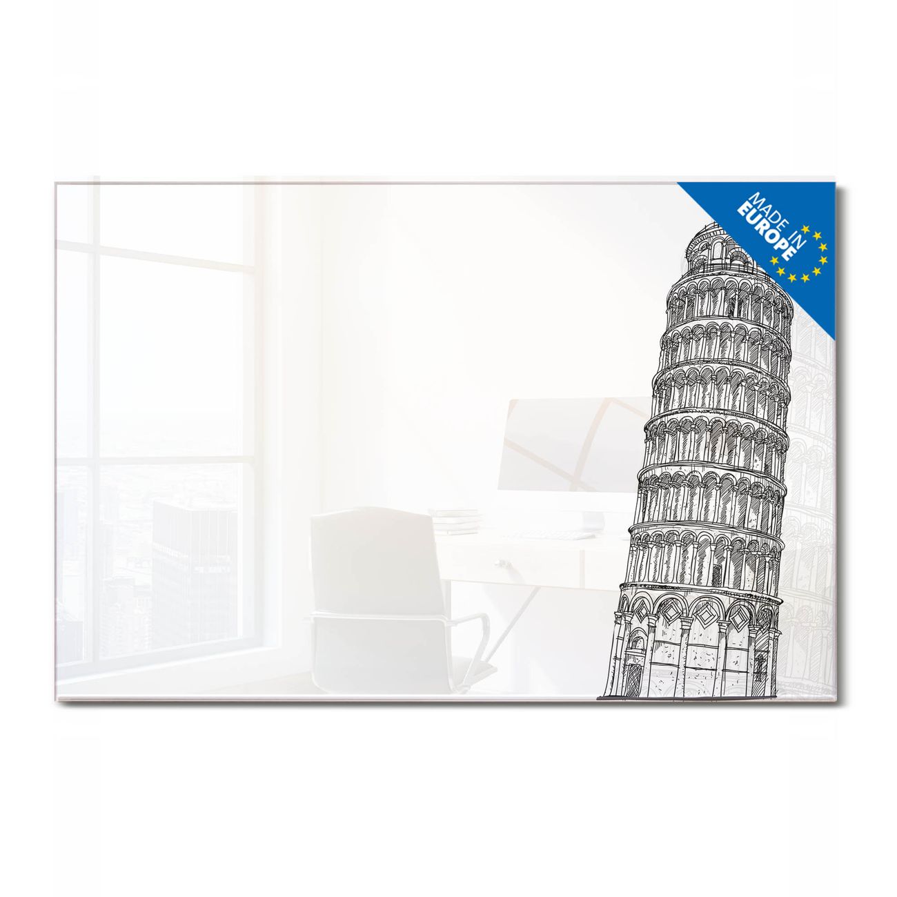 Material: 4mm Sicherheitsglas mit Metallrückwand Eigenschaften: beschreibbar, magnetisch, kratzfest Maße: 75x50x0,6cm, 5,63kg schwer Motiv Nummer 13241 Schiefer Turm von Pisa Zubehör: inklusive 4 Neodym-Magnete