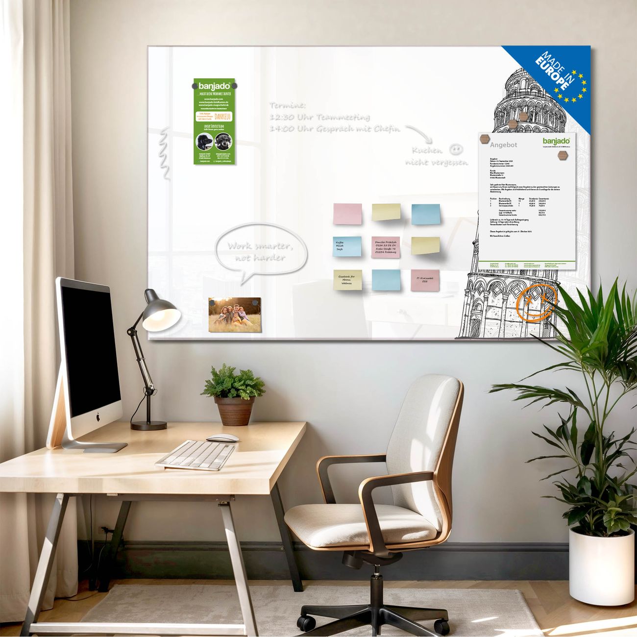 Jede Glas Magnettafel wird in unserer Werkstatt von Hand gefertigt und sorgfältig geprüft. So erhalten Sie ein echtes Qualitätsprodukt, das Funktion und Ästhetik perfekt vereint.?? Warum banjado?