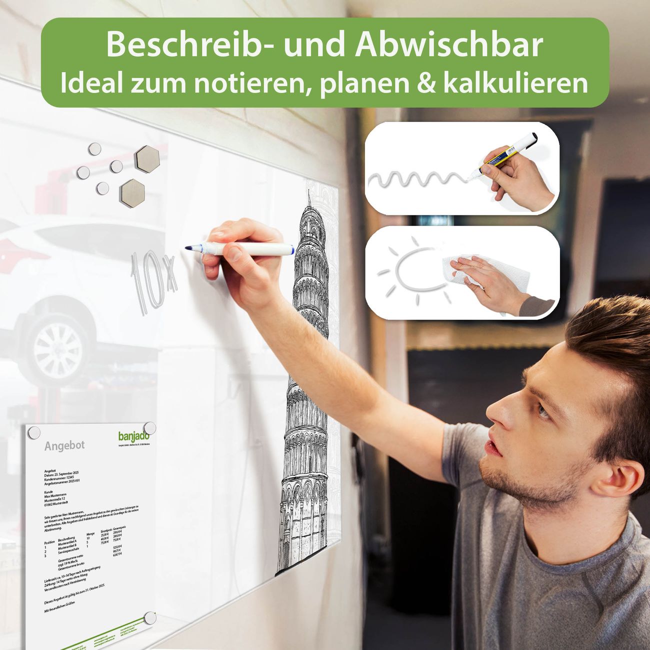 Bitte beachten Sie, dass ausschliessliche spezielle Magnete an der Glastafel haften. Wir empfehlen banjado Neodym Magnete, diese sind durch uns auf Wirksamkeit geprüft.