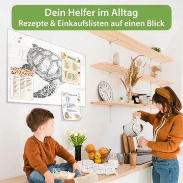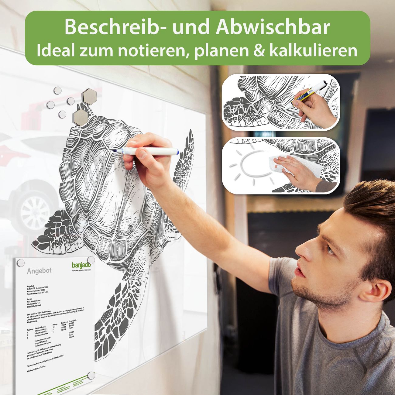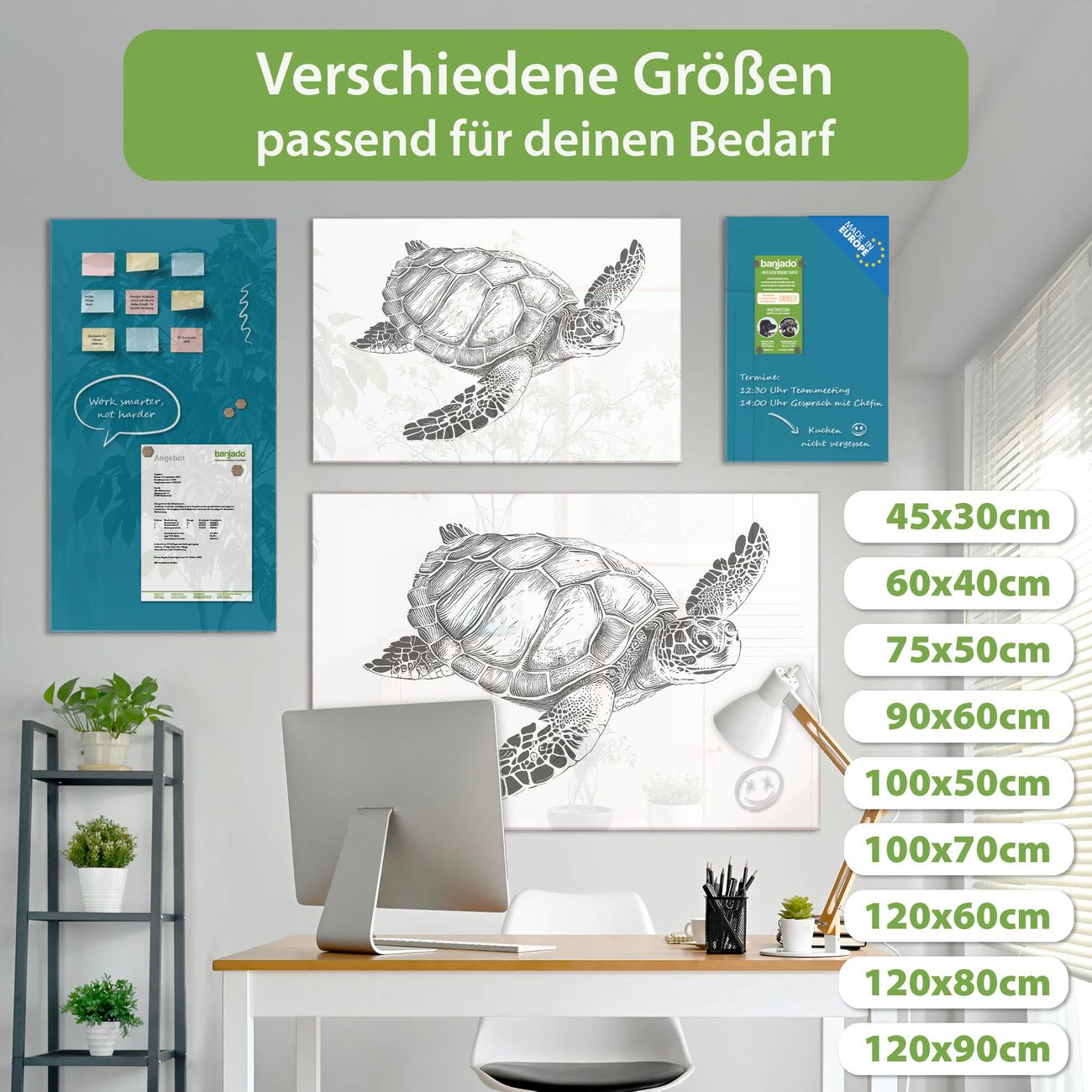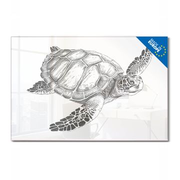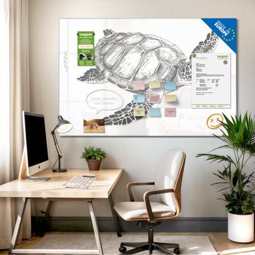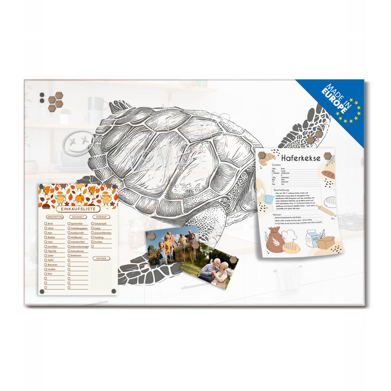 Material: 4mm Sicherheitsglas mit Metallrückwand Eigenschaften: beschreibbar, magnetisch, kratzfest Maße: 75x50x0,6cm, 5,63kg schwer Motiv Nummer 13030 Schildkröte 2 Zubehör: inklusive 4 Neodym-Magnete