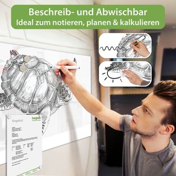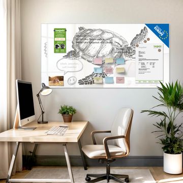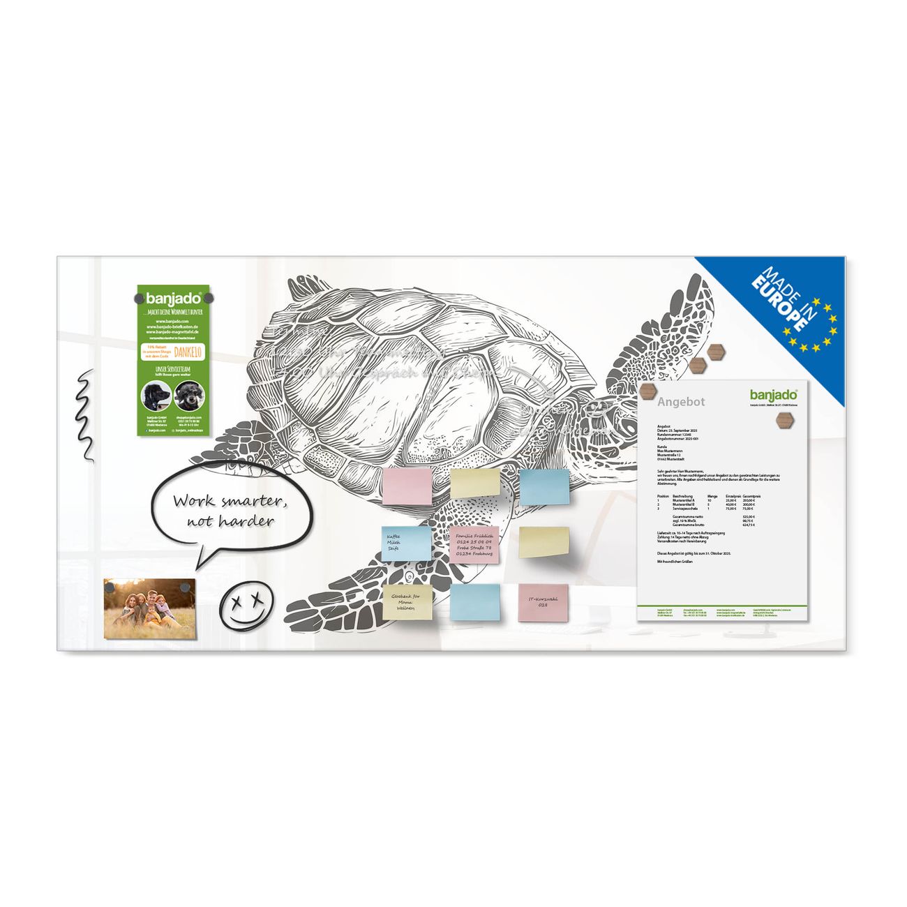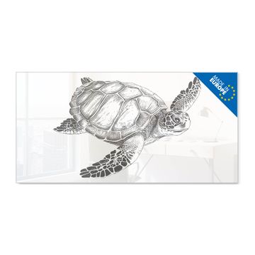 Material: 4mm Sicherheitsglas mit Metallrückwand Eigenschaften: beschreibbar, magnetisch, kratzfest Maße: 100x50x0,6cm, 7,50kg schwer Motiv Nummer 13030 Schildkröte 2 Zubehör: inklusive 4 Neodym-Magnete