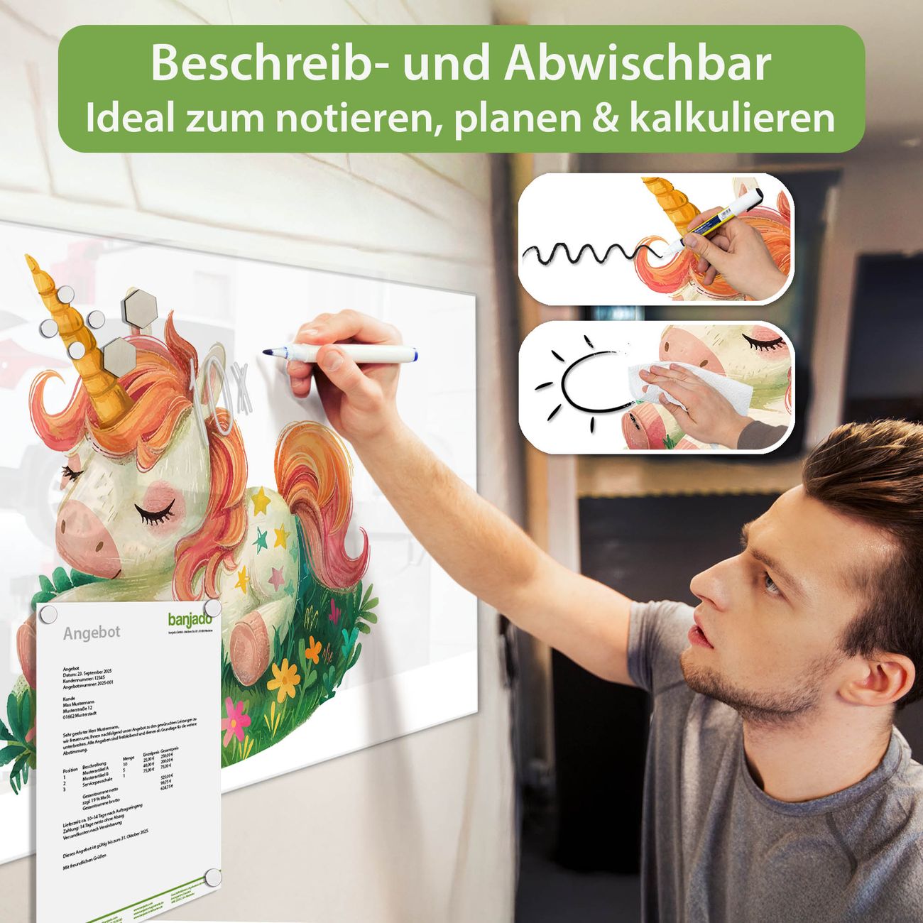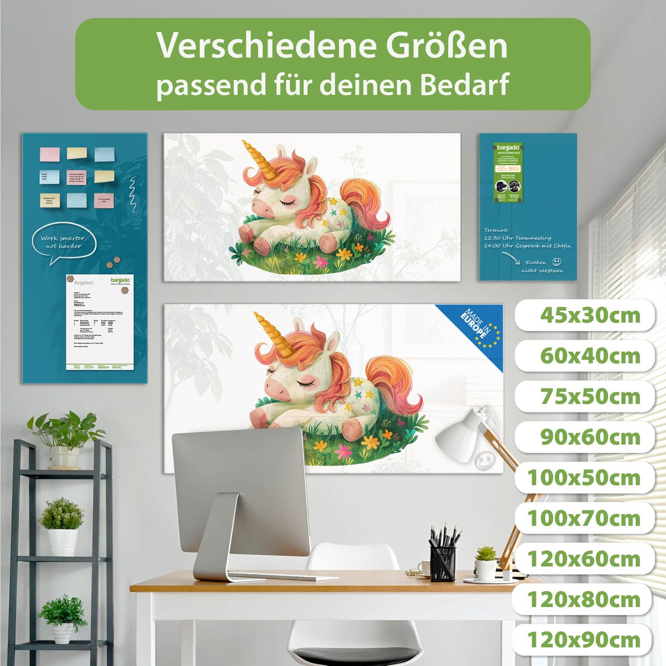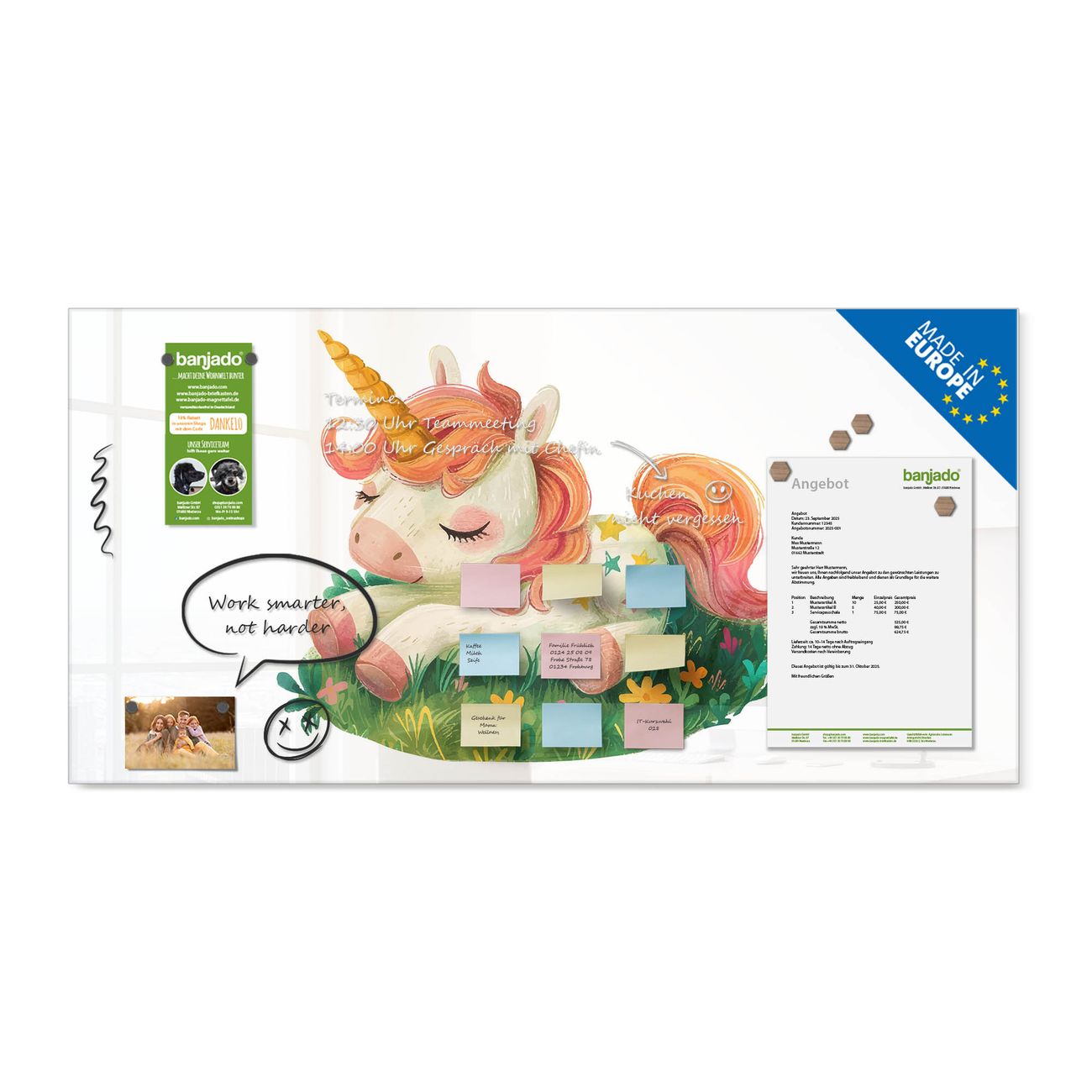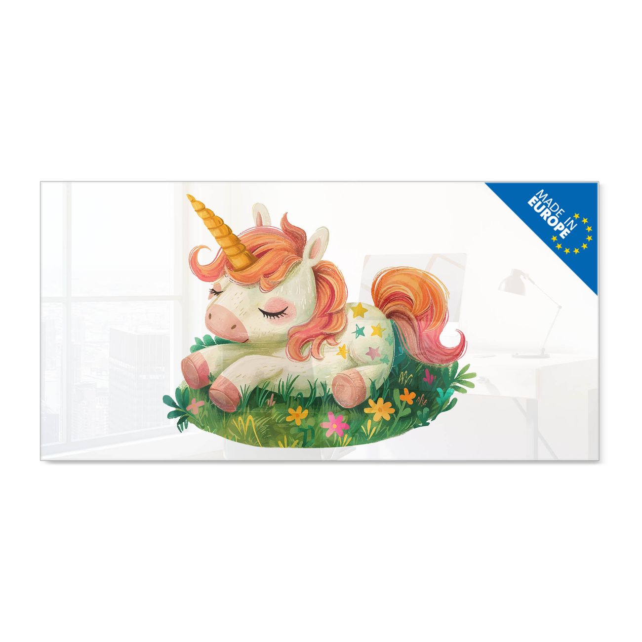Material: 4mm Sicherheitsglas mit Metallrückwand Eigenschaften: beschreibbar, magnetisch, kratzfest Maße: 100x50x0,6cm, 7,50kg schwer Motiv Nummer 13261 Schlafendes Einhorn Zubehör: inklusive 4 Neodym-Magnete