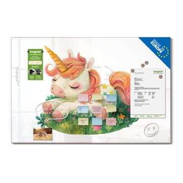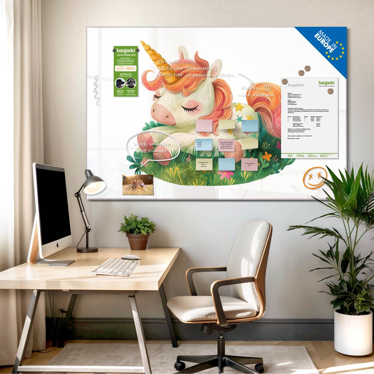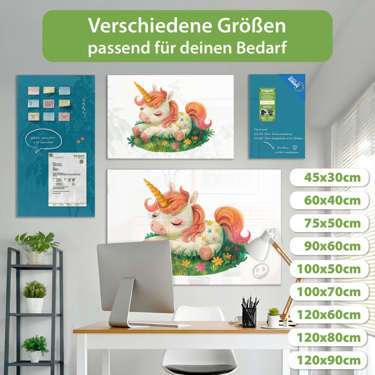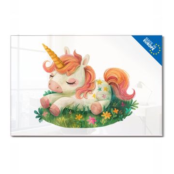 Material: 4mm Sicherheitsglas mit Metallrückwand Eigenschaften: beschreibbar, magnetisch, kratzfest Maße: 120x80x0,6cm, 14,40kg schwer Motiv Nummer 13261 Schlafendes Einhorn Zubehör: inklusive 4 Neodym-Magnete