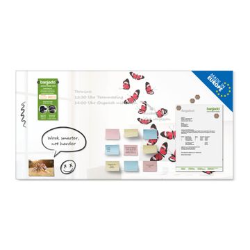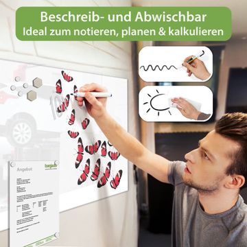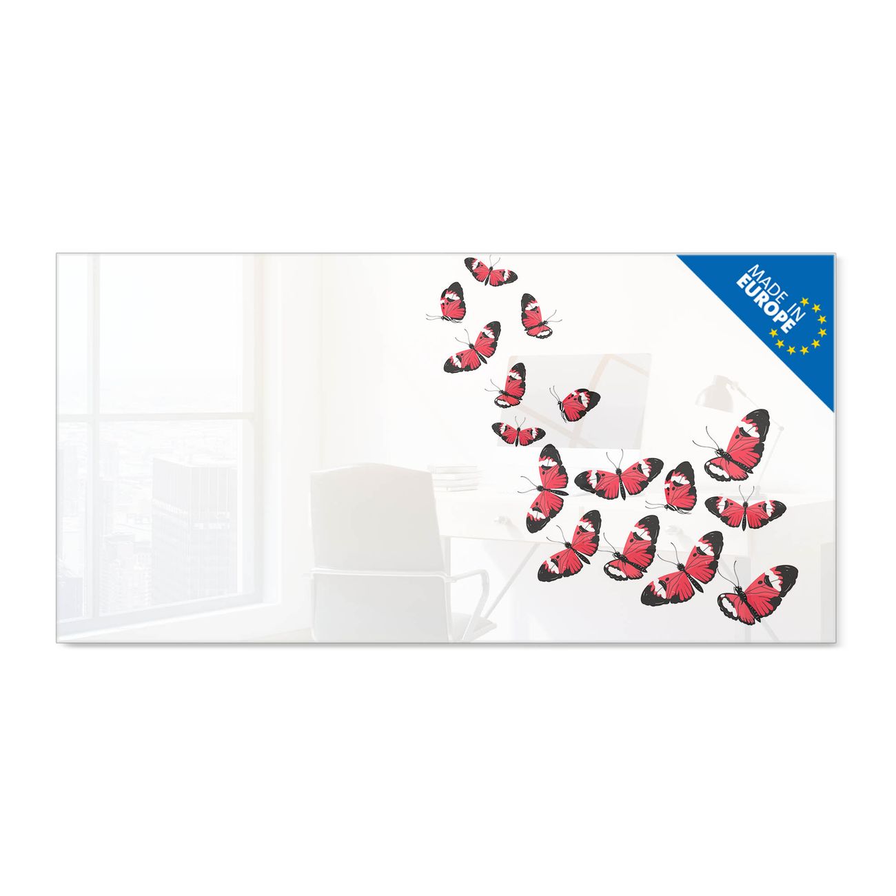 Material: 4mm Sicherheitsglas mit Metallrückwand Eigenschaften: beschreibbar, magnetisch, kratzfest Maße: 120x60x0,6cm, 10,80kg schwer Motiv Nummer 13477 Schmetterlingsflug Zubehör: inklusive 4 Neodym-Magnete