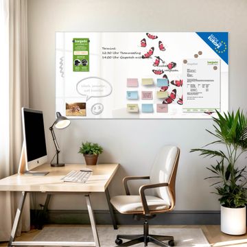 Auf der glatten Glasoberfläche lassen sich Termine, Rezepte oder Notizen ganz einfach mit Kreidestiften festhalten und rückstandslos entfernen. Starke Neodym-Magnete halten Ihre wichtigsten Erinnerungen sicher an Ort und Stelle. So entsteht Ihre ganz persönliche Ideenwand - jeden Tag neu.