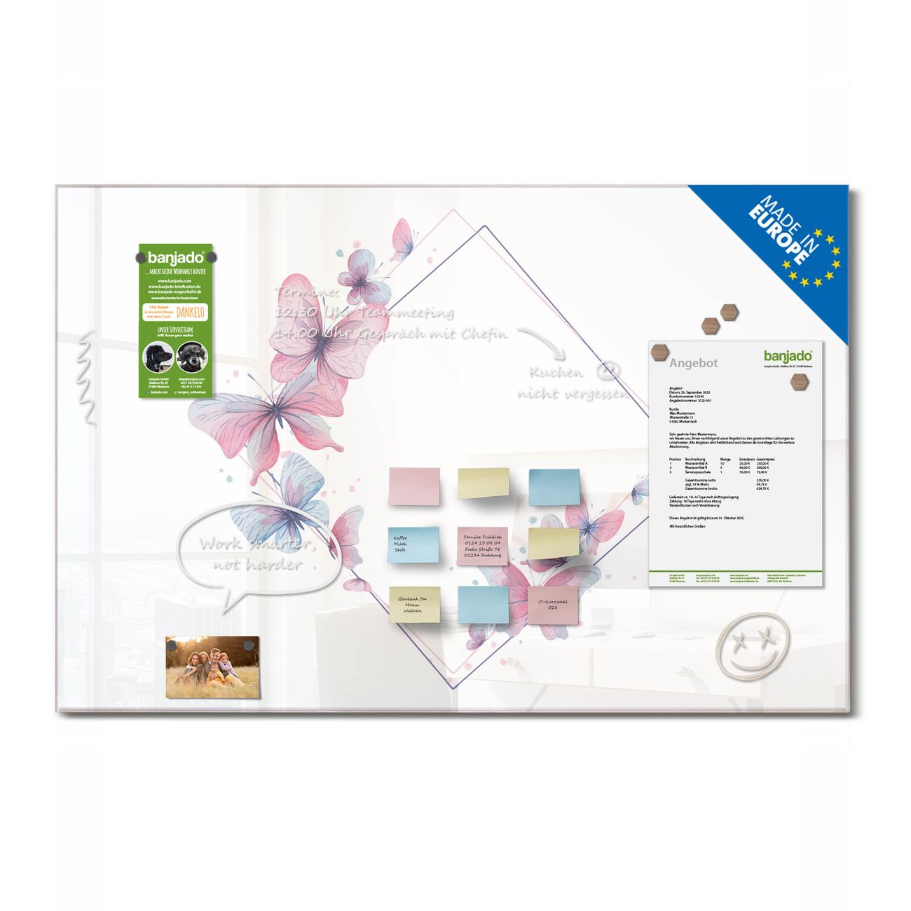 Jede Glas Magnettafel wird in unserer Werkstatt von Hand gefertigt und sorgfältig geprüft. So erhalten Sie ein echtes Qualitätsprodukt, das Funktion und Ästhetik perfekt vereint.?? Warum banjado?