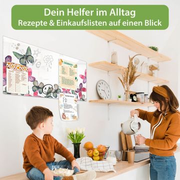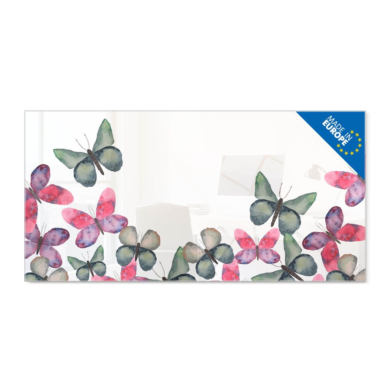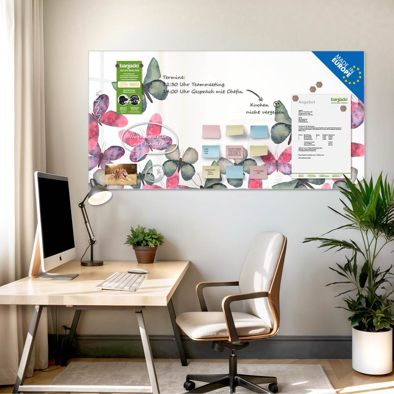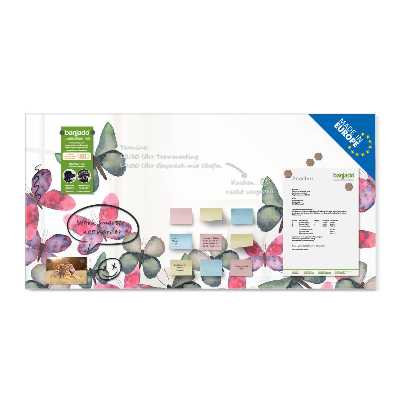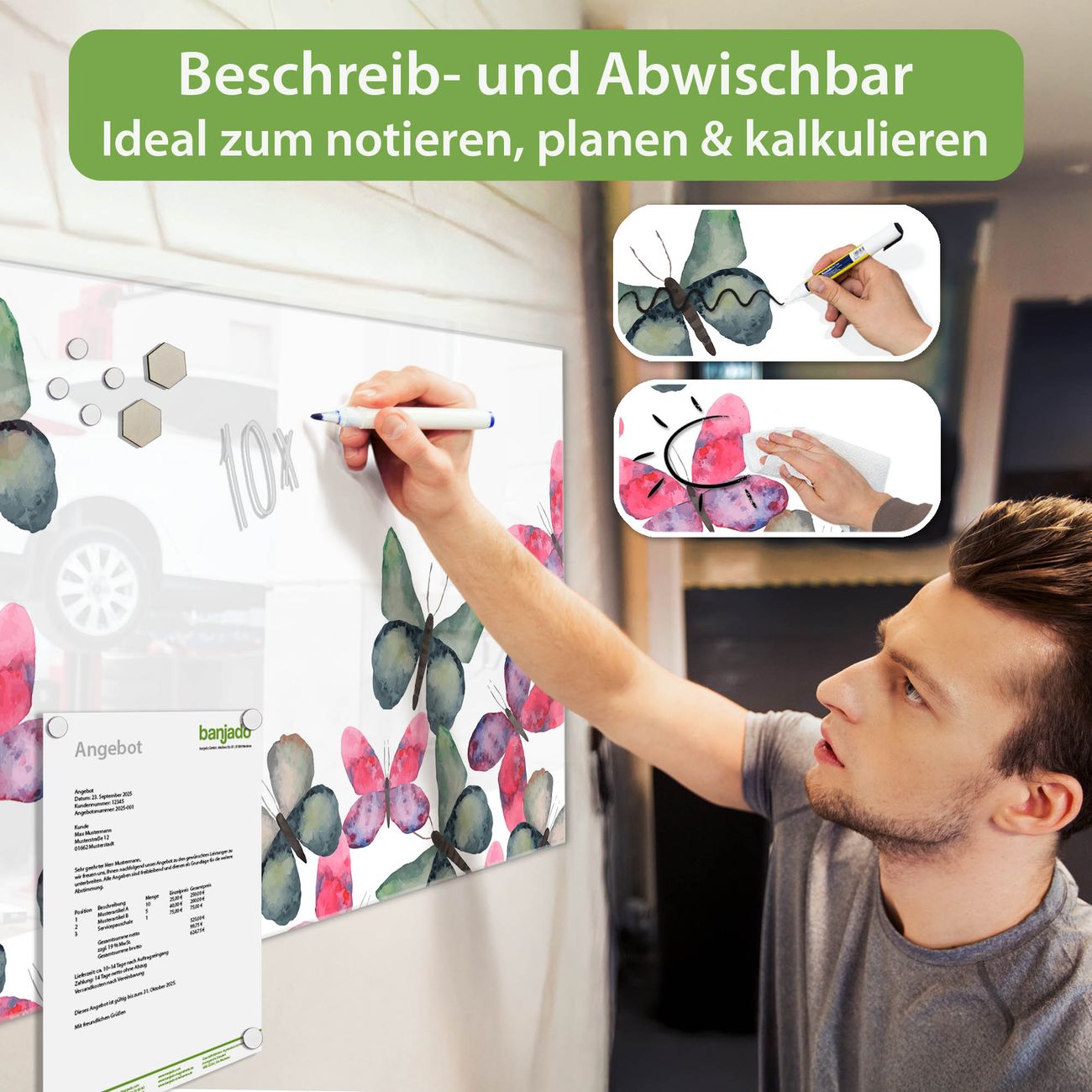 Material: 4mm Sicherheitsglas mit Metallrückwand Eigenschaften: beschreibbar, magnetisch, kratzfest Maße: 100x50x0,6cm, 7,50kg schwer Motiv Nummer 13486 Schmetterlingszauber Zubehör: inklusive 4 Neodym-Magnete