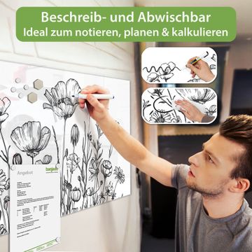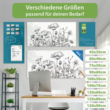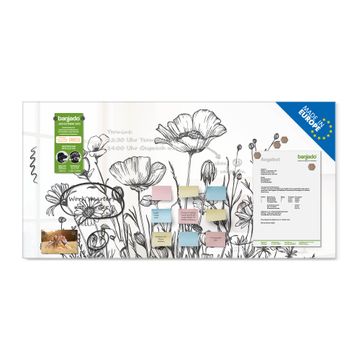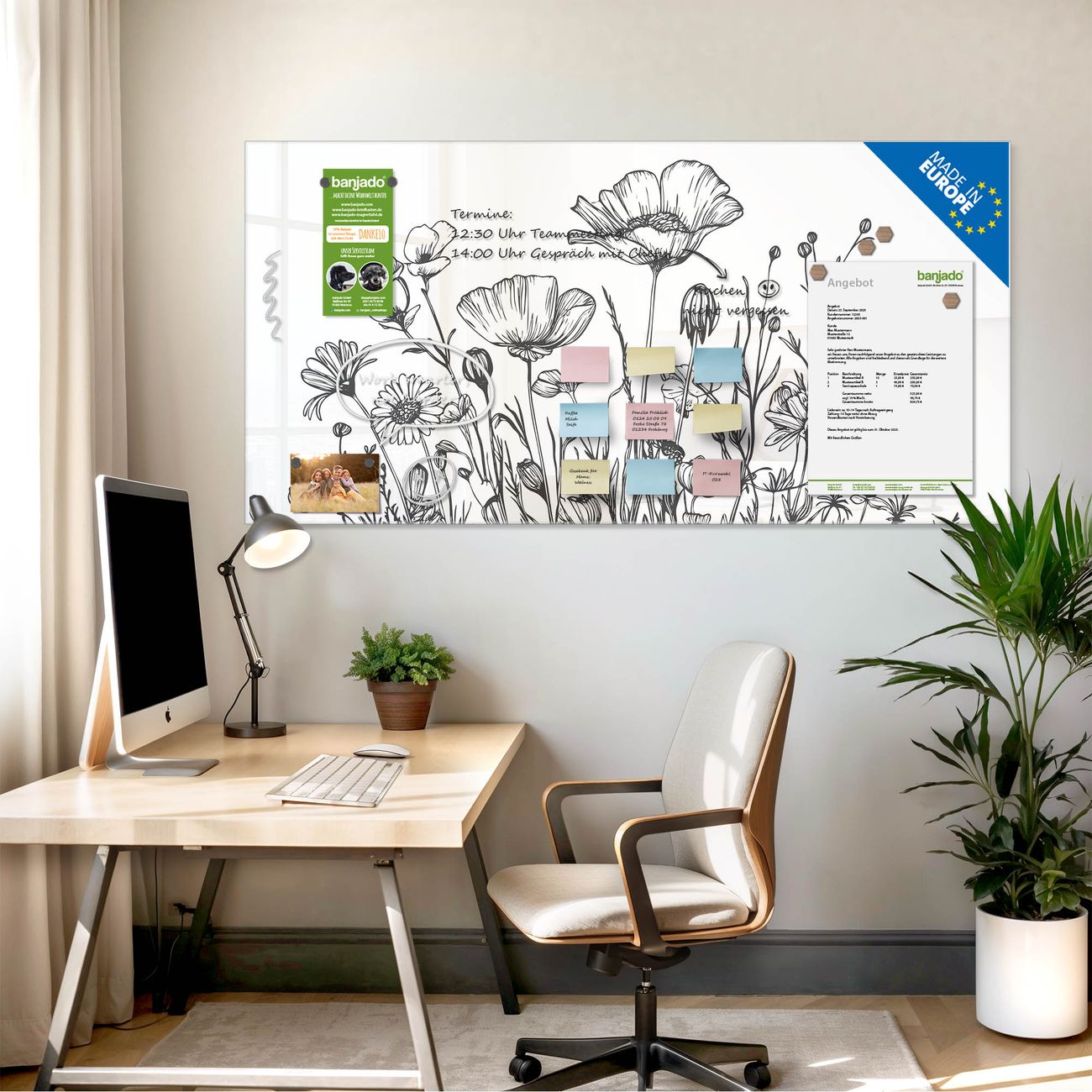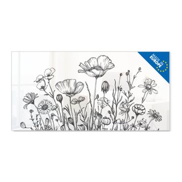 Material: 4mm Sicherheitsglas mit Metallrückwand Eigenschaften: beschreibbar, magnetisch, kratzfest Maße: 100x50x0,6cm, 7,50kg schwer Motiv Nummer 13225 Schwarz-Weiß Blumenzeichnung Zubehör: inklusive 4 Neodym-Magnete