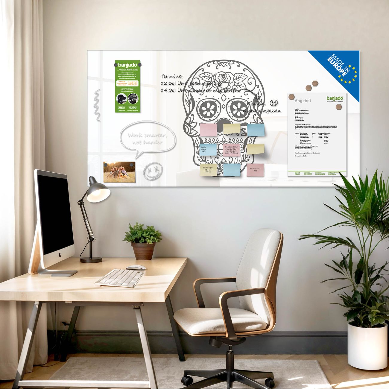 Ein Stück Design, das Ihren Alltag organisiert. Schreiben, heften, inspirieren - alles an einem Ort. Qualität, die man spürt. Montage leicht gemacht. Handwerk mit Herz - veredelt in Sachsen. Einzigartiges Design mit Motiv Motiv Schwarz-Weiß Sugar Skull Beschreibbare Glasoberfläche, leicht zu reinigen Starke Magnetkraft durch Stahlrückwand Inklusive 4 Neodym-Magneten Flexible Montageoptionen Handveredelt in Sachsen - Qualität, die bleibt