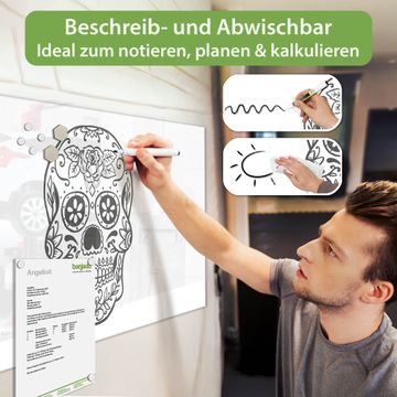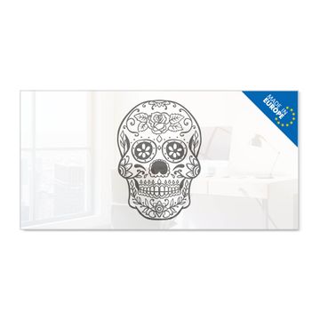 Material: 4mm Sicherheitsglas mit Metallrückwand Eigenschaften: beschreibbar, magnetisch, kratzfest Maße: 100x50x0,6cm, 7,50kg schwer Motiv Nummer 13332 Schwarz-Weiß Sugar Skull Zubehör: inklusive 4 Neodym-Magnete