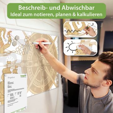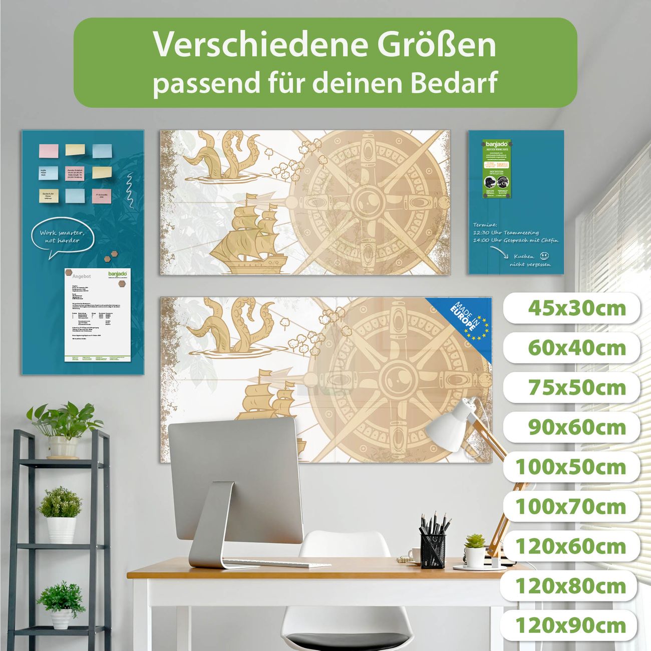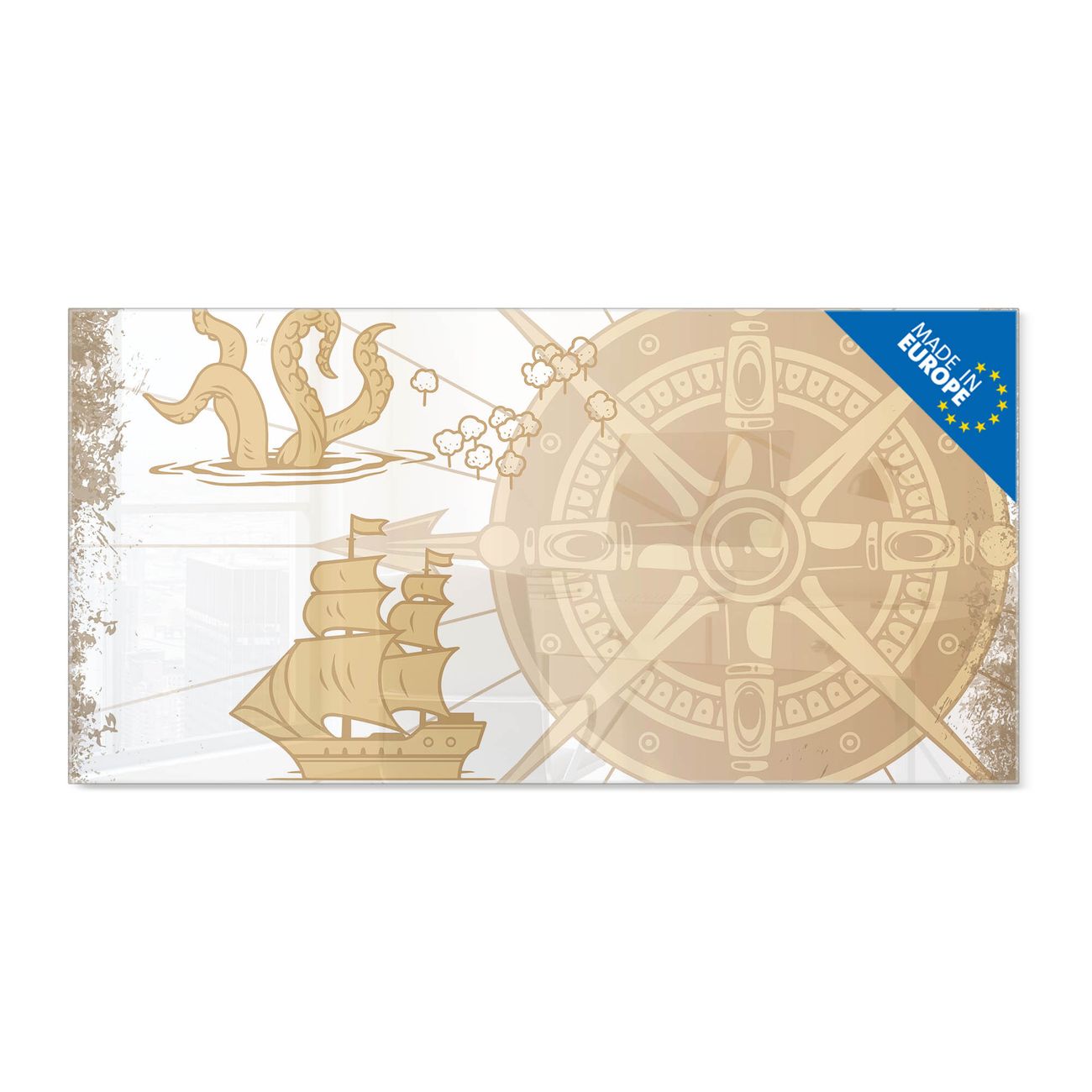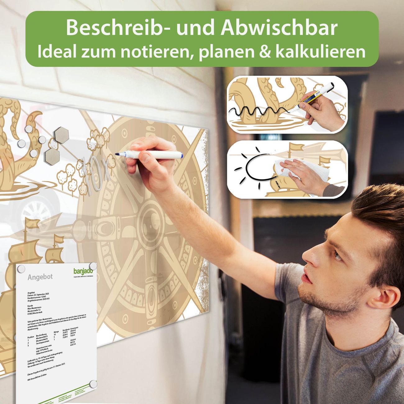 Material: 4mm Sicherheitsglas mit Metallrückwand Eigenschaften: beschreibbar, magnetisch, kratzfest Maße: 100x50x0,6cm, 7,50kg schwer Motiv Nummer 13583 Seemonster und Segelschiff Zubehör: inklusive 4 Neodym-Magnete