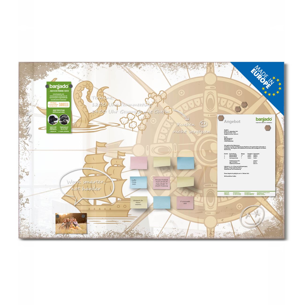 Ein Stück Design, das Ihren Alltag organisiert. Schreiben, heften, inspirieren - alles an einem Ort. Qualität, die man spürt. Montage leicht gemacht. Handwerk mit Herz - veredelt in Sachsen. Einzigartiges Design mit Motiv Motiv Seemonster und Segelschiff Beschreibbare Glasoberfläche, leicht zu reinigen Starke Magnetkraft durch Stahlrückwand Inklusive 4 Neodym-Magneten Flexible Montageoptionen Handveredelt in Sachsen - Qualität, die bleibt