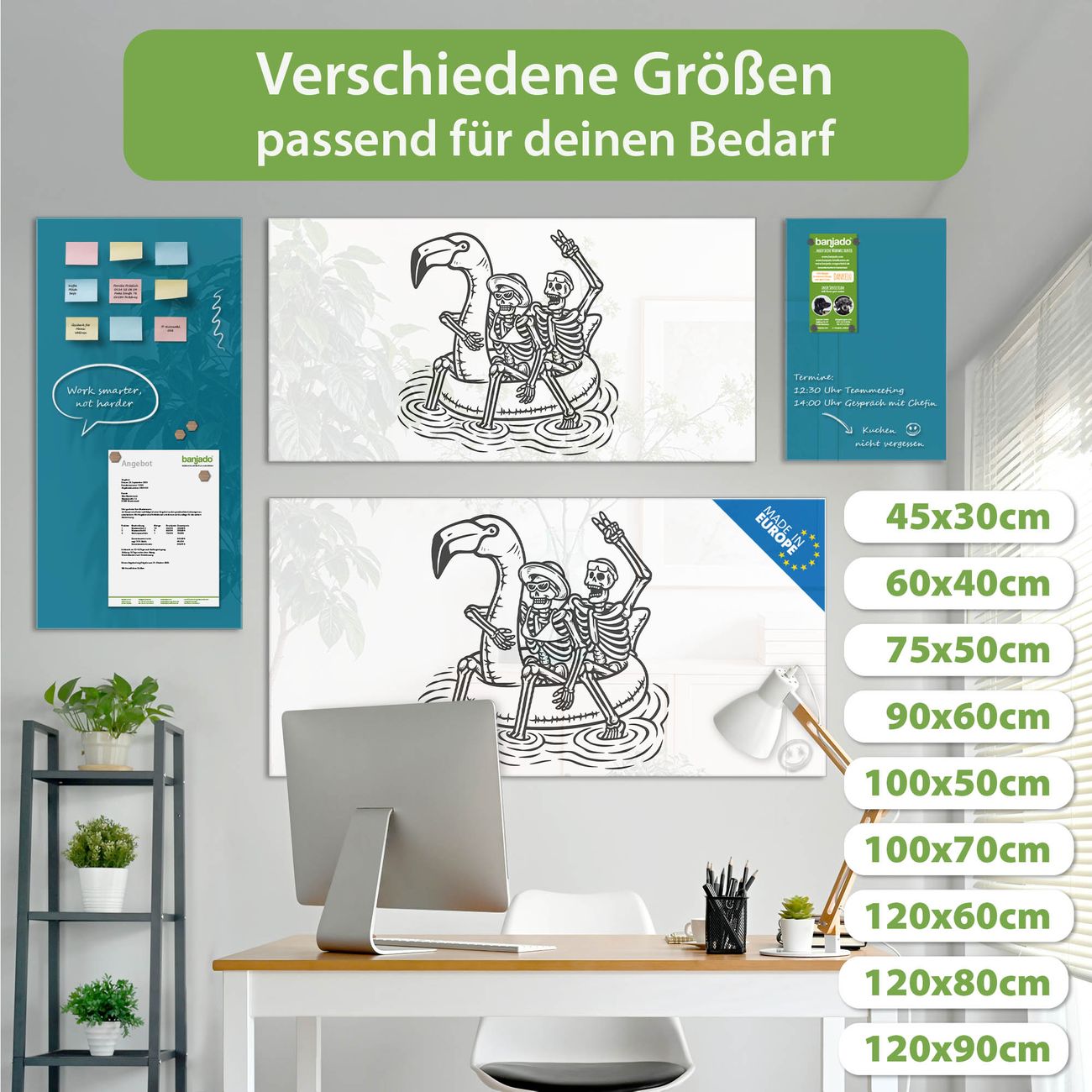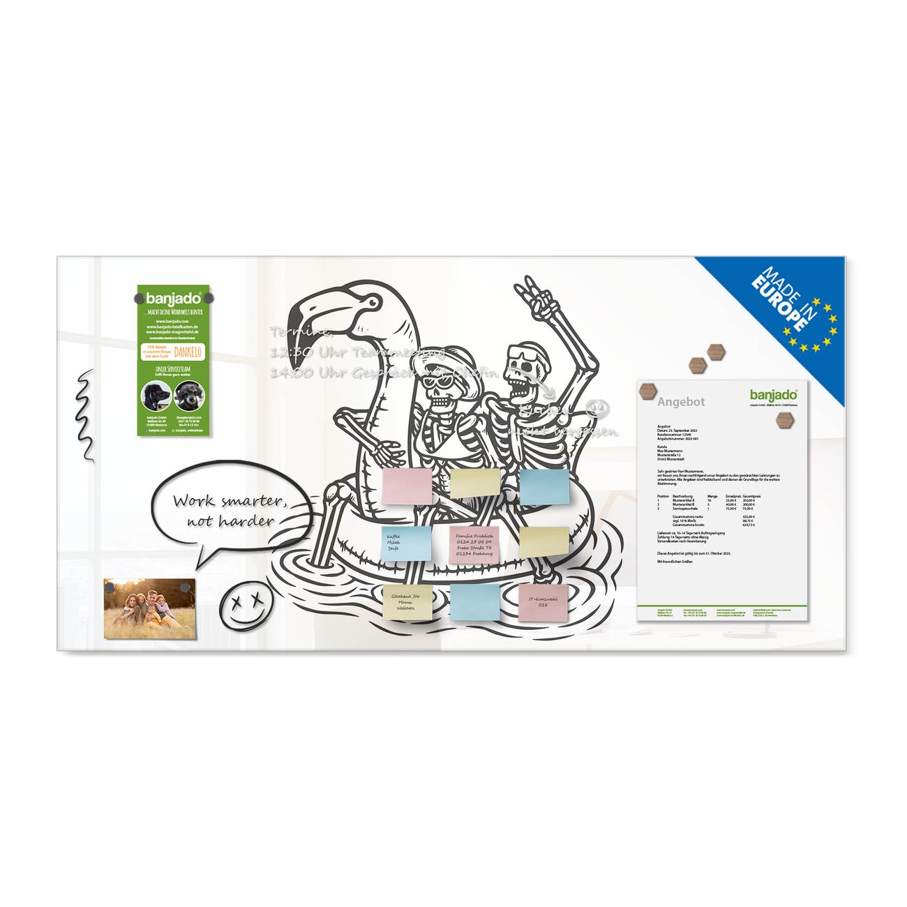 Material: 4mm Sicherheitsglas mit Metallrückwand Eigenschaften: beschreibbar, magnetisch, kratzfest Maße: 100x50x0,6cm, 7,50kg schwer Motiv Nummer 13096 Skelette mit Flamingoschwimmring 2 Zubehör: inklusive 4 Neodym-Magnete