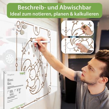 Auf der glatten Glasoberfläche lassen sich Termine, Rezepte oder Notizen ganz einfach mit Kreidestiften festhalten und rückstandslos entfernen. Starke Neodym-Magnete halten Ihre wichtigsten Erinnerungen sicher an Ort und Stelle. So entsteht Ihre ganz persönliche Ideenwand - jeden Tag neu.