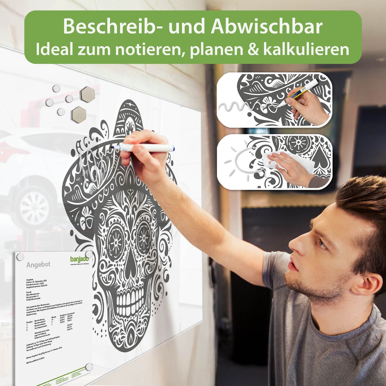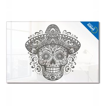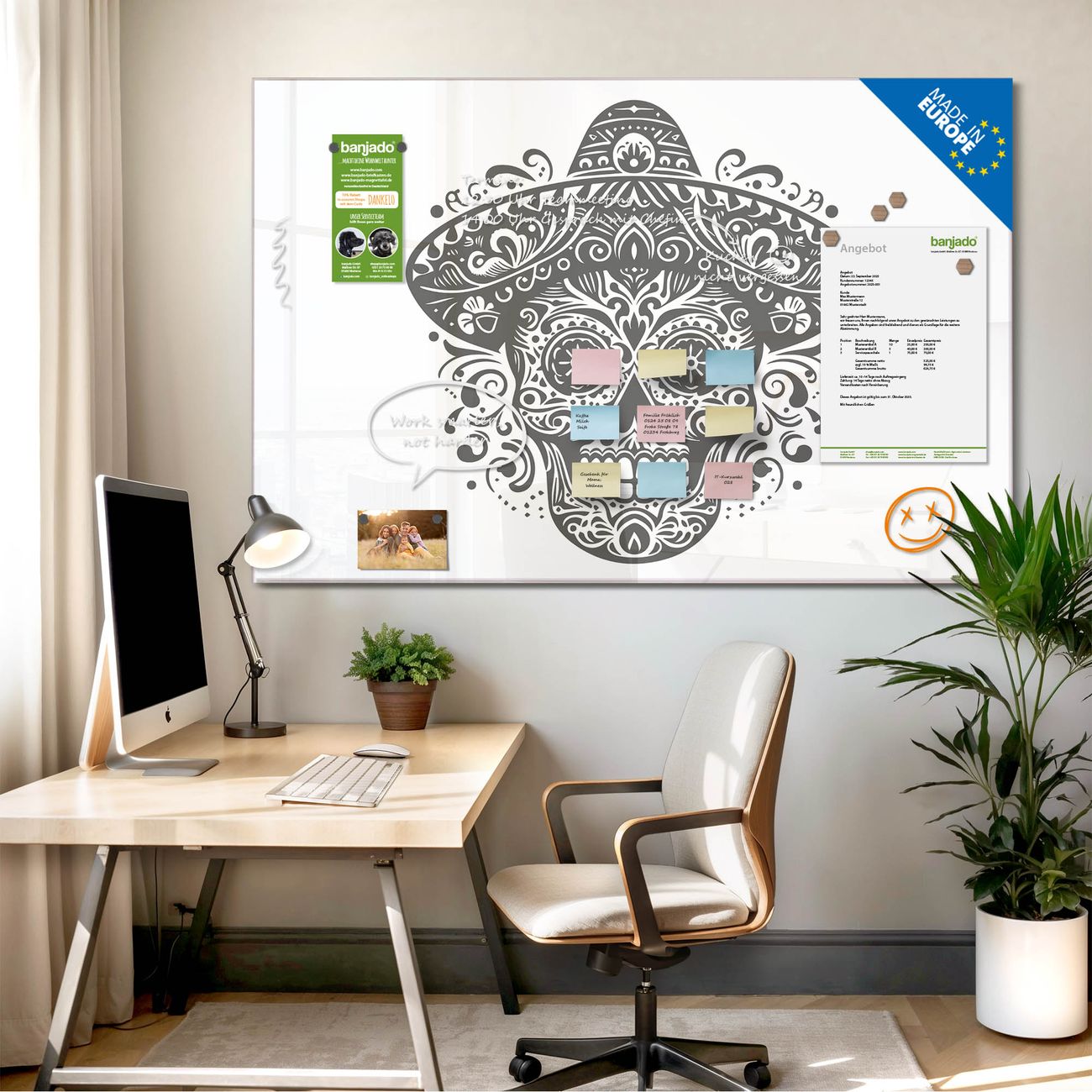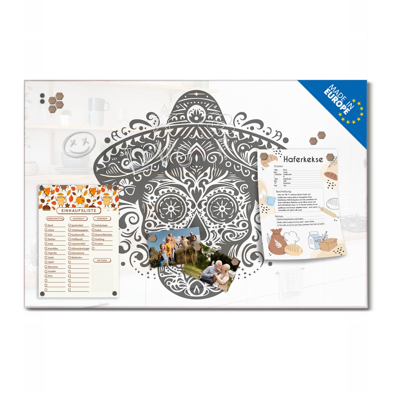 Material: 4mm Sicherheitsglas mit Metallrückwand Eigenschaften: beschreibbar, magnetisch, kratzfest Maße: 90x60x0,6cm, 8,10kg schwer Motiv Nummer 13331 Sombrero Totenkopf Zubehör: inklusive 4 Neodym-Magnete