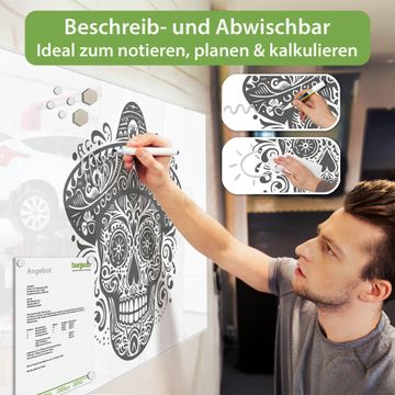 Auf der glatten Glasoberfläche lassen sich Termine, Rezepte oder Notizen ganz einfach mit Kreidestiften festhalten und rückstandslos entfernen. Starke Neodym-Magnete halten Ihre wichtigsten Erinnerungen sicher an Ort und Stelle. So entsteht Ihre ganz persönliche Ideenwand - jeden Tag neu.