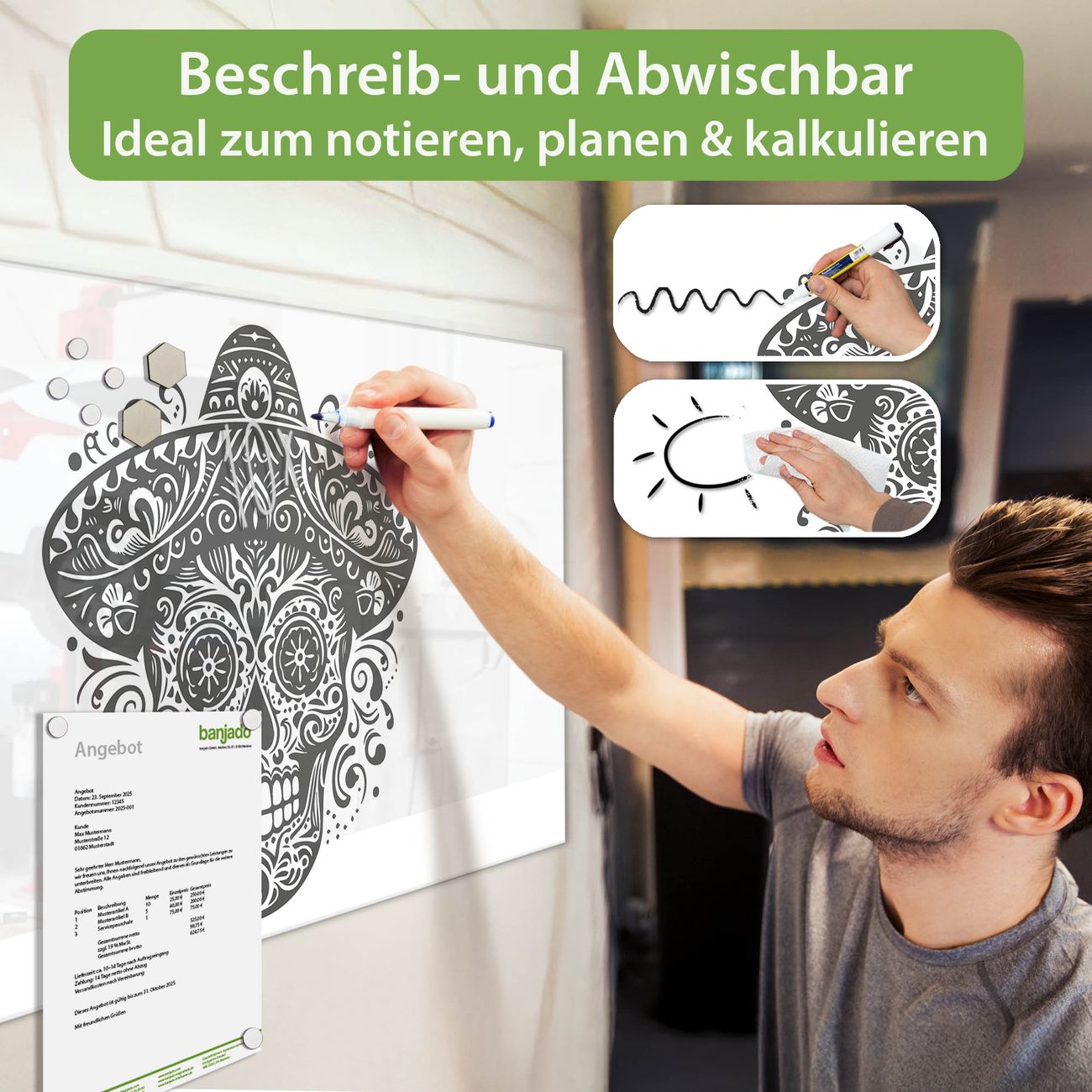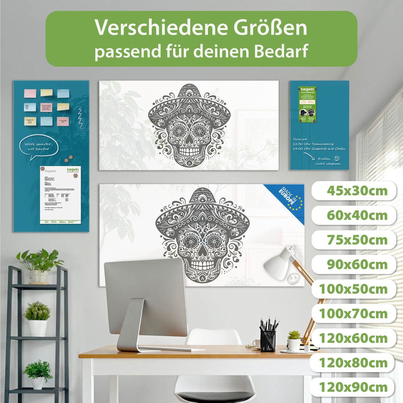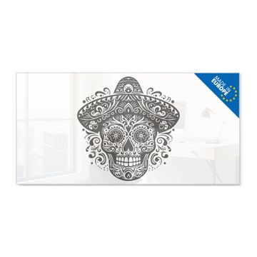 Material: 4mm Sicherheitsglas mit Metallrückwand Eigenschaften: beschreibbar, magnetisch, kratzfest Maße: 120x60x0,6cm, 10,80kg schwer Motiv Nummer 13331 Sombrero Totenkopf Zubehör: inklusive 4 Neodym-Magnete