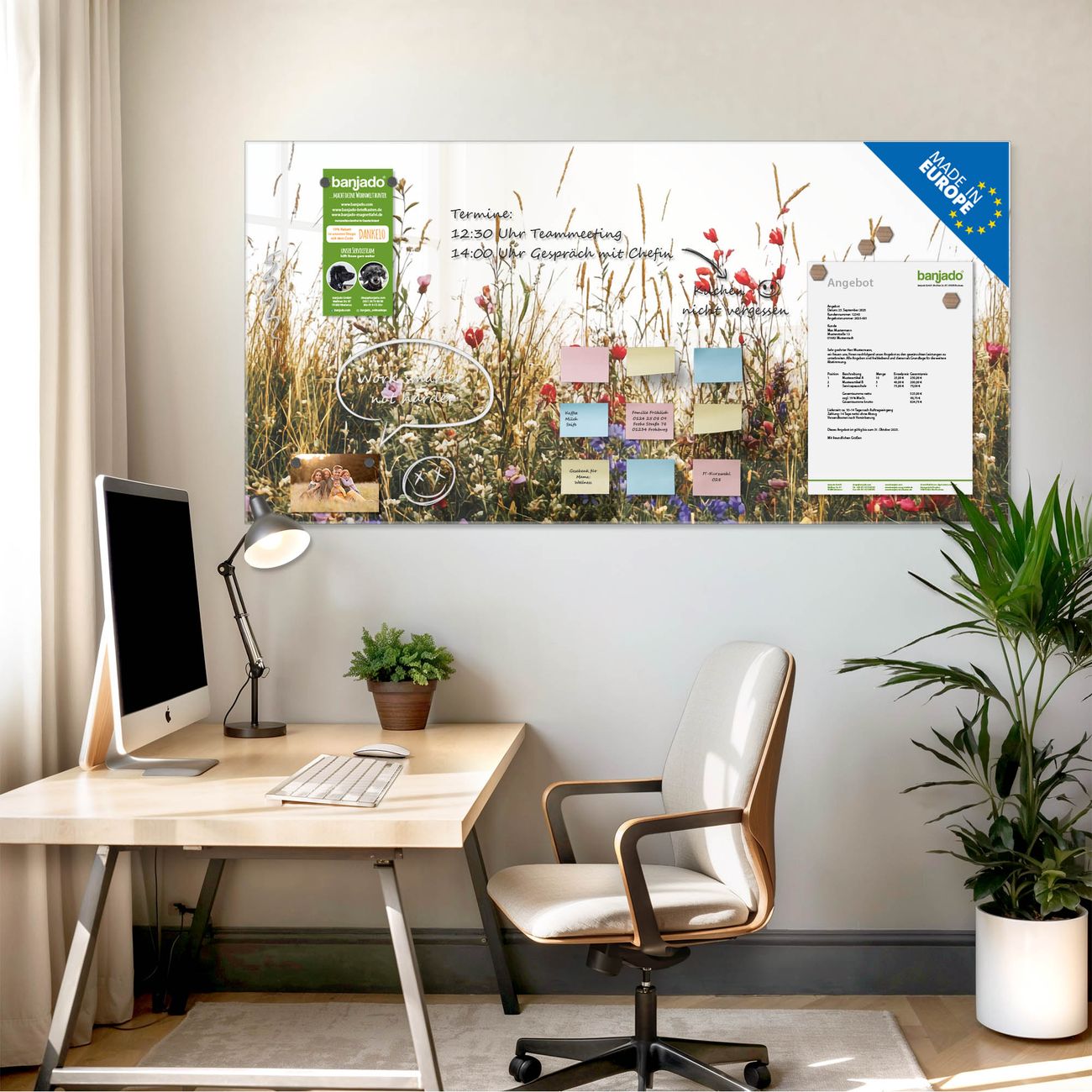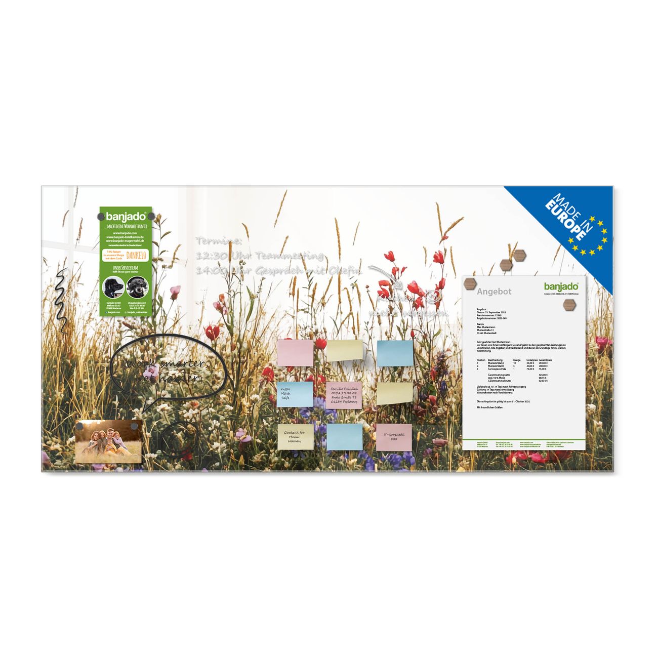 Ein Stück Design, das Ihren Alltag organisiert. Schreiben, heften, inspirieren - alles an einem Ort. Qualität, die man spürt. Montage leicht gemacht. Handwerk mit Herz - veredelt in Sachsen. Einzigartiges Design mit Motiv Motiv Sommerliche Blumenwiese Beschreibbare Glasoberfläche, leicht zu reinigen Starke Magnetkraft durch Stahlrückwand Inklusive 4 Neodym-Magneten Flexible Montageoptionen Handveredelt in Sachsen - Qualität, die bleibt